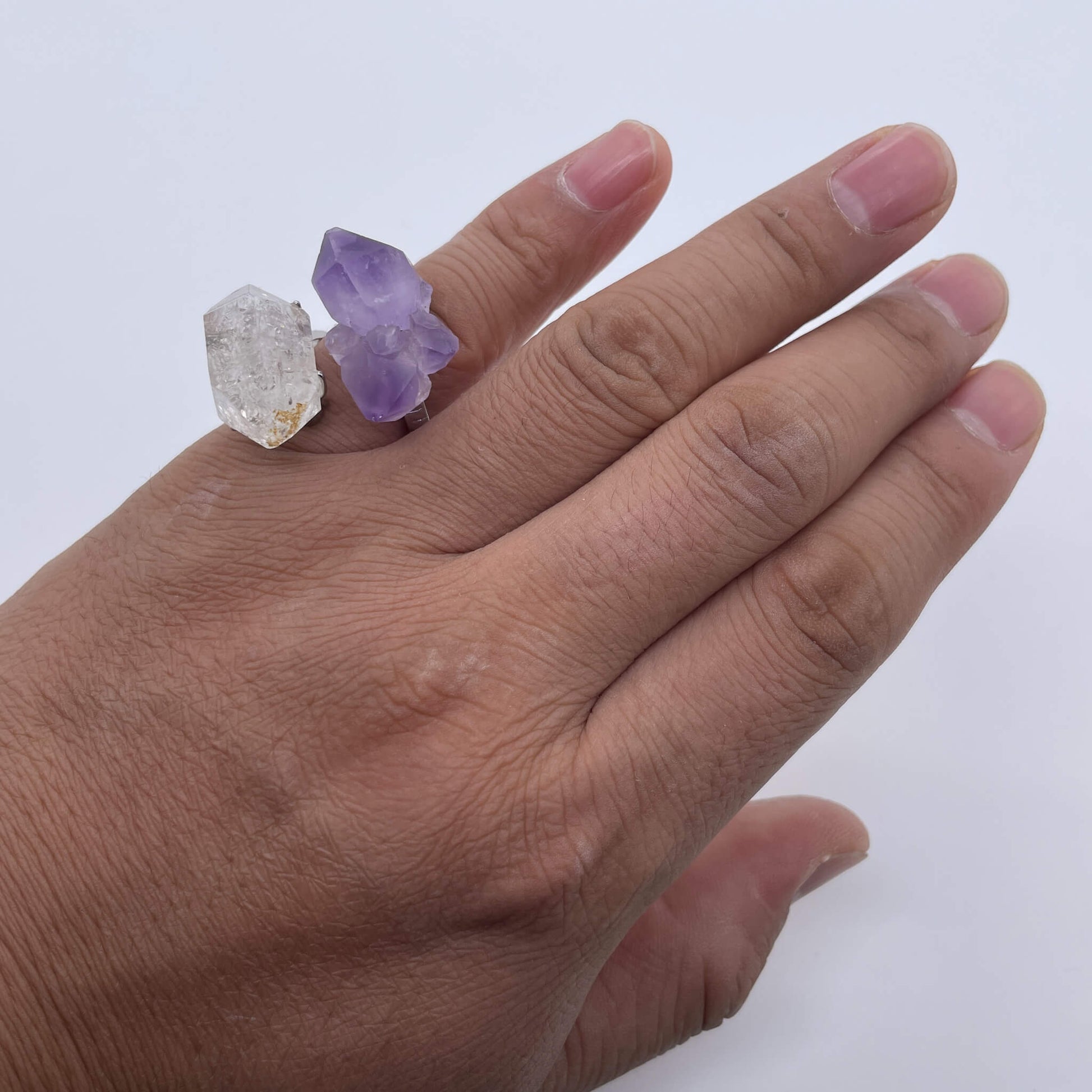 Amethyst is often considered to have the meaning of guarding love and bringing wisdom and tranquility; crystal symbolizes purity, transparency and spirituality, and can convey pure and flawless beautiful expectations, as well as the yearning for a clear mind and a bright life. Combining the two, this ring not only has a romantic and dreamy color, but also contains the pursuit of a pure heart and a better future. It is a carrier of good wishes and natural charm.