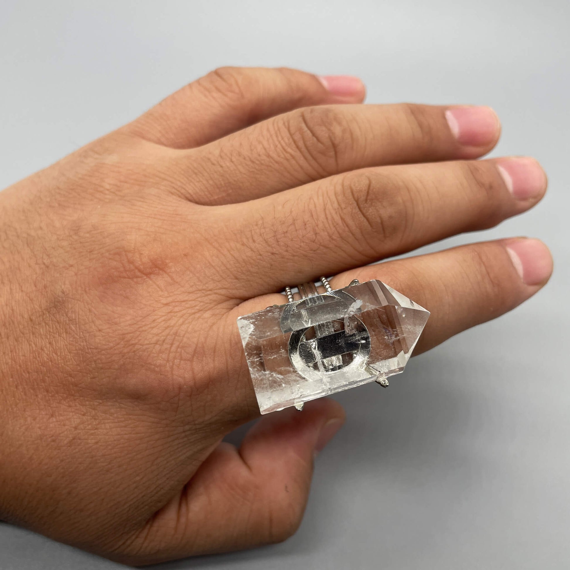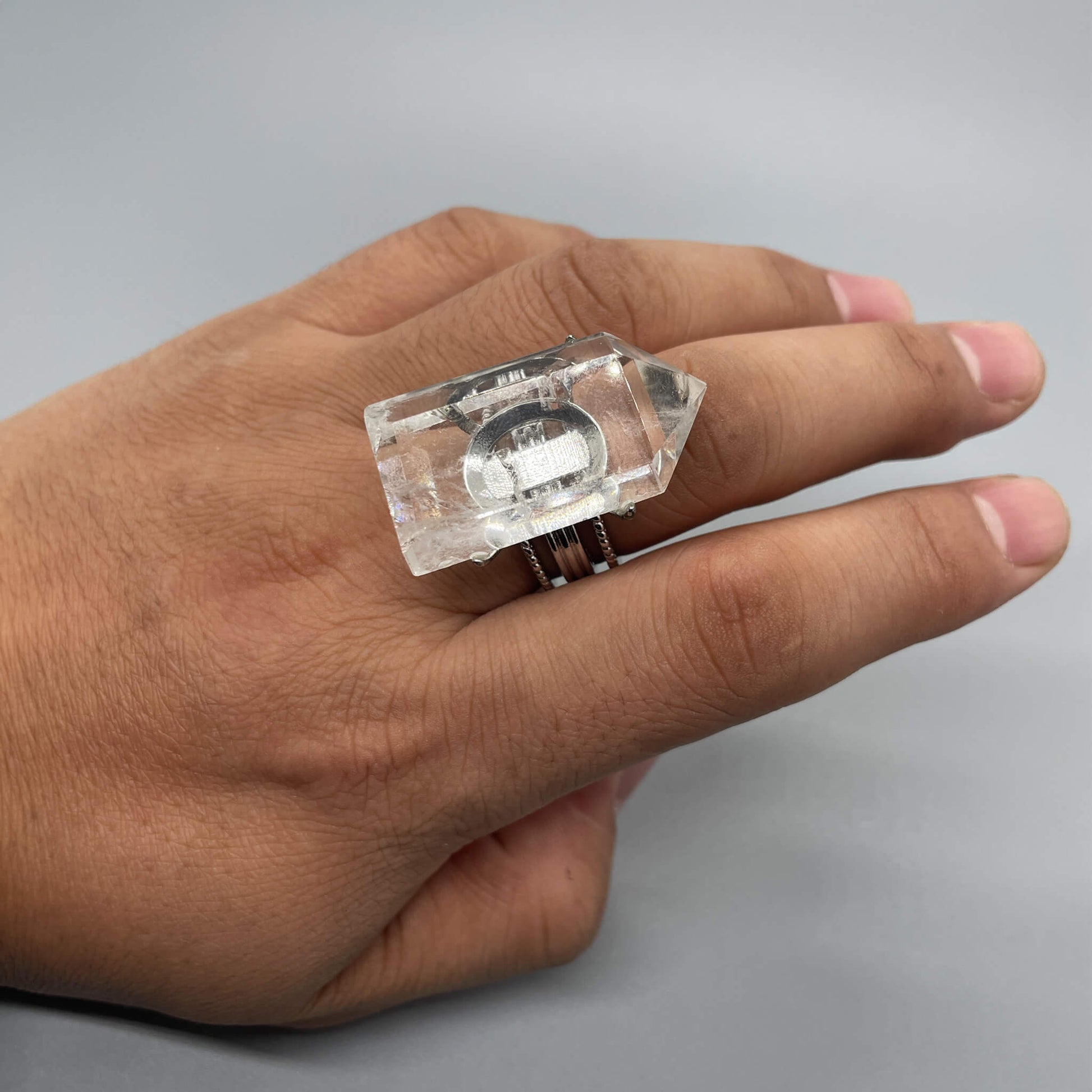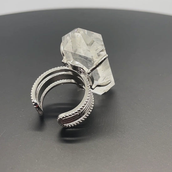 The main body of the ring is a natural raw white crystal stone, and the ring setting is made of alloy.
