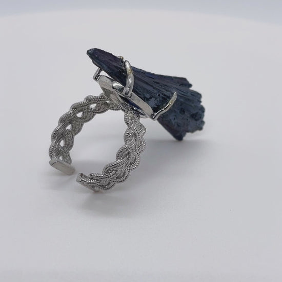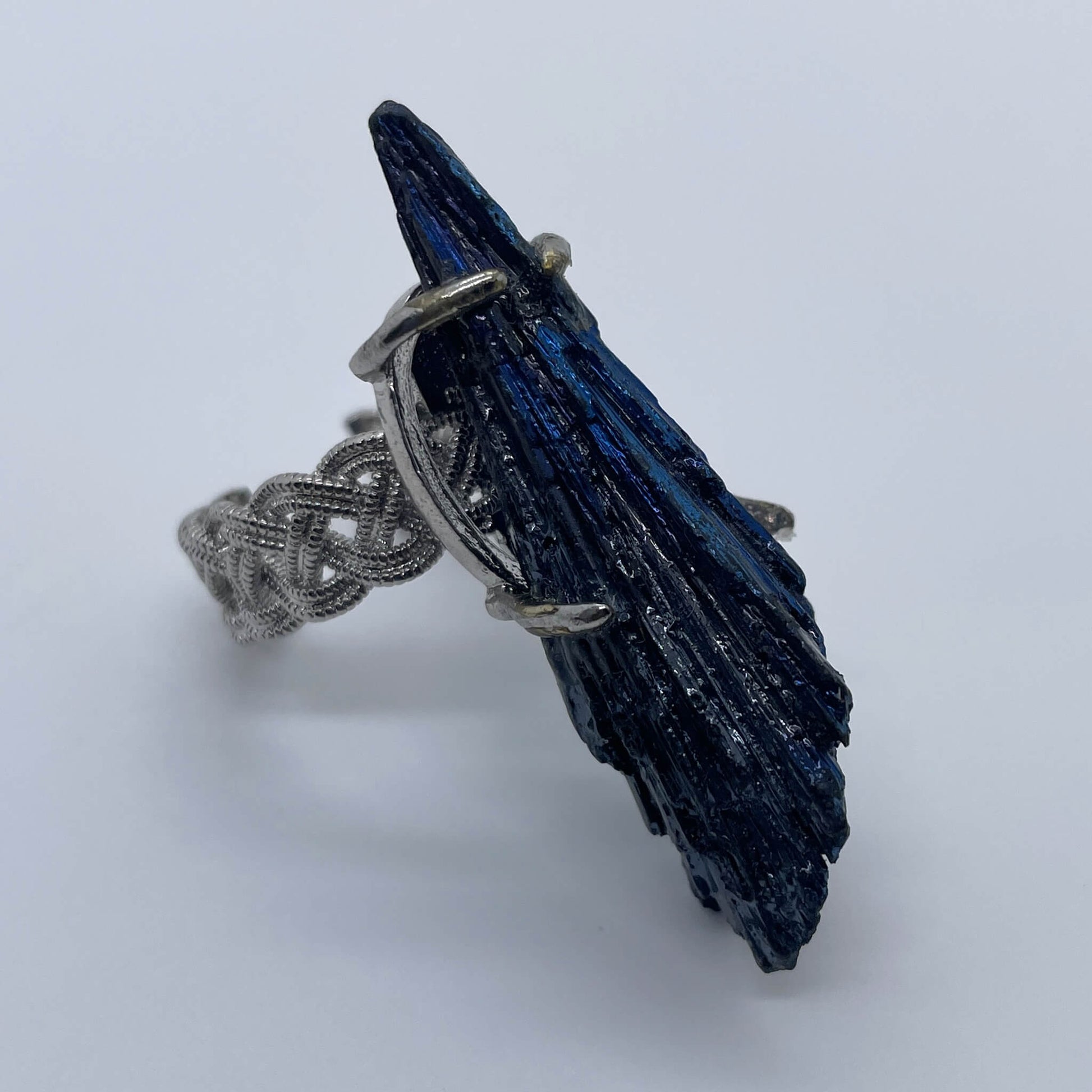 Blue crystal symbolizes wisdom, courage, and protection. Its deep blue color contains calm wisdom, and its sharp shape represents fearless courage, implying that it can dispel confusion, endow the wearer with decisiveness, and protect their inner pursuit and forward direction. Silver symbolizes purity and eternity. Combined with blue crystal, it not only highlights the natural sharpness and mysterious color of the raw stone but also conveys the adherence to a pure original intention and lasting belief through the characteristics of silver. Overall, the ring carries multiple meanings of wisdom leading the way, courage breaking through difficulties, and belief lasting forever.