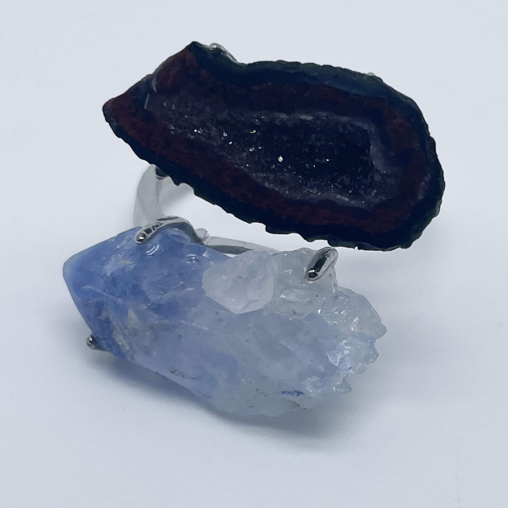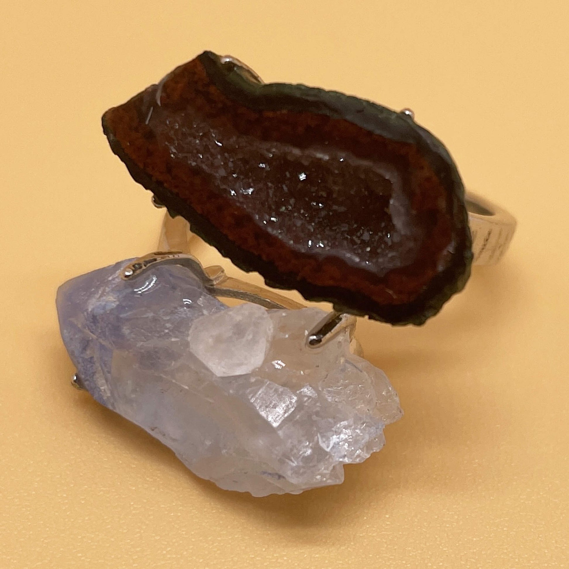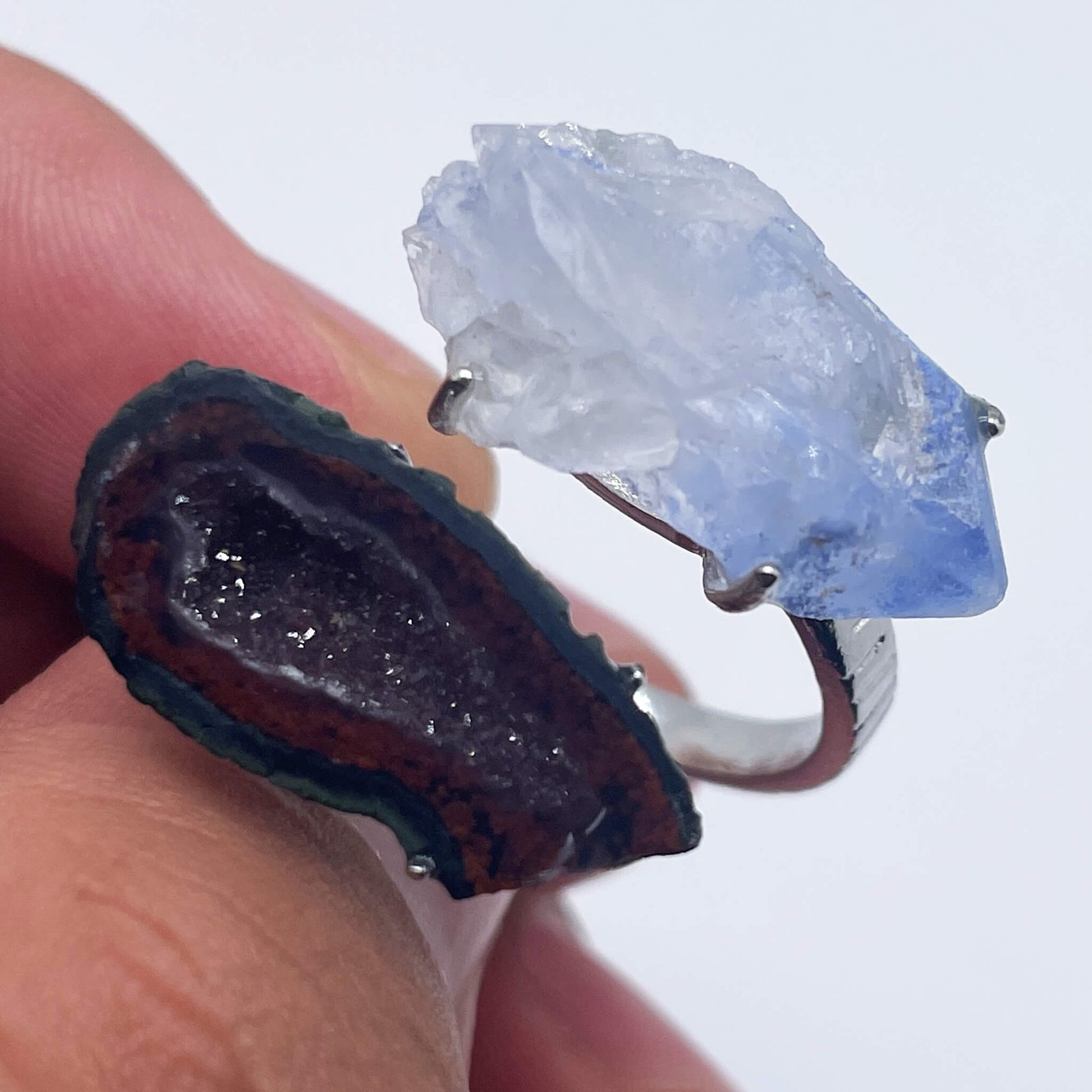 The main stones of the ring are dark brown agate geode and light blue crystal. The ring setting is made of alloy.