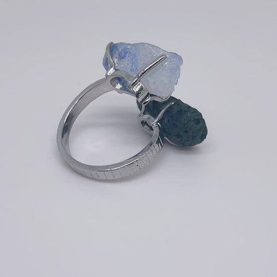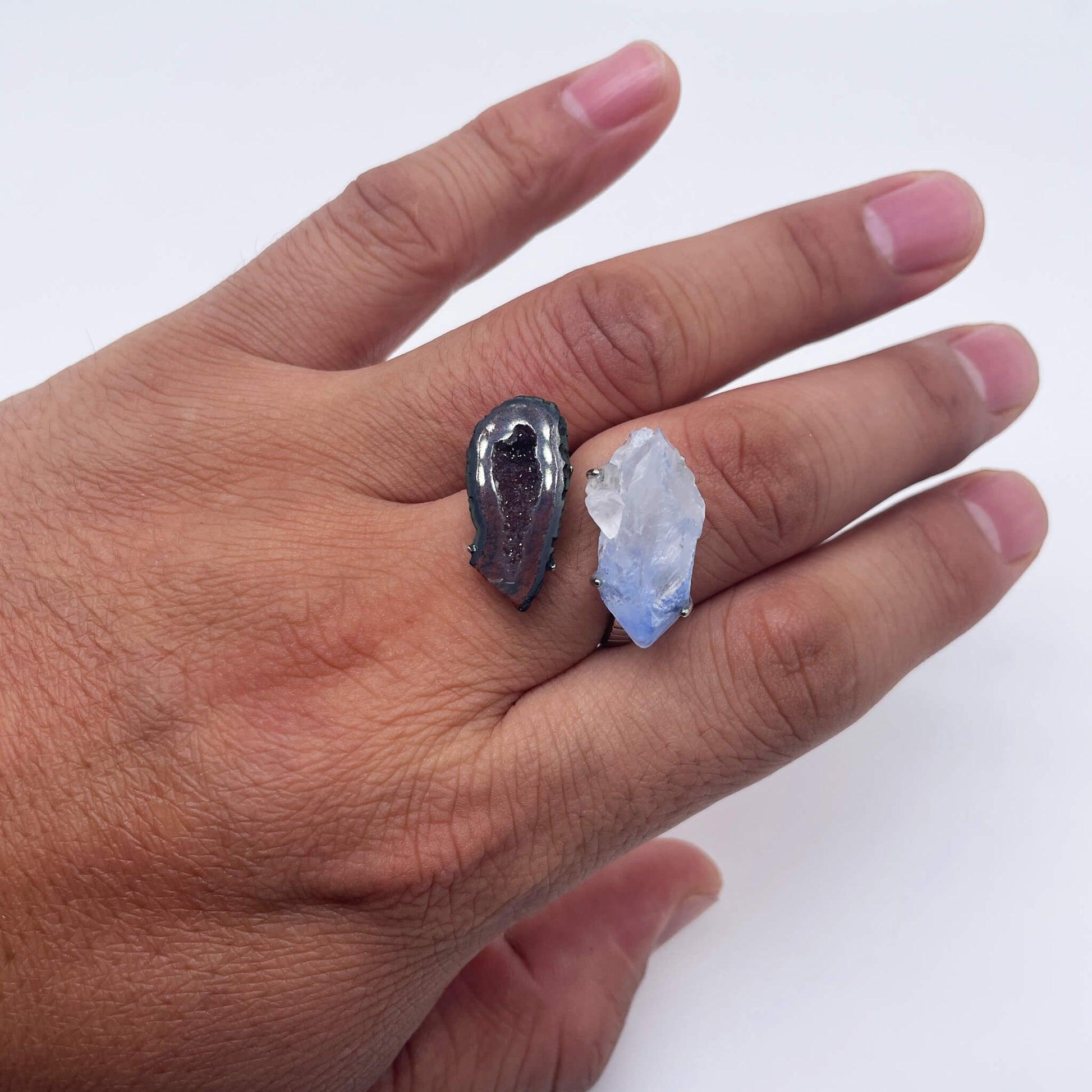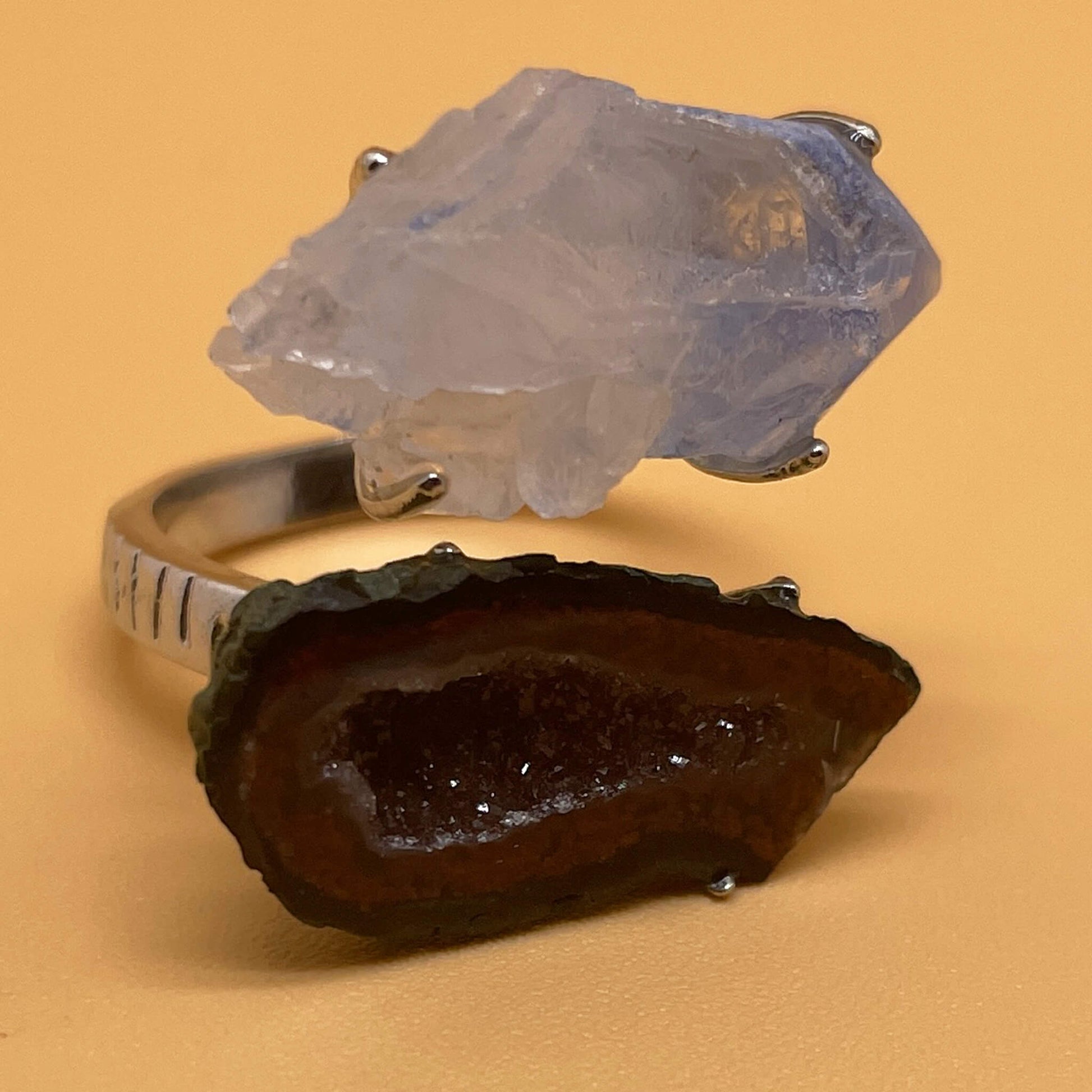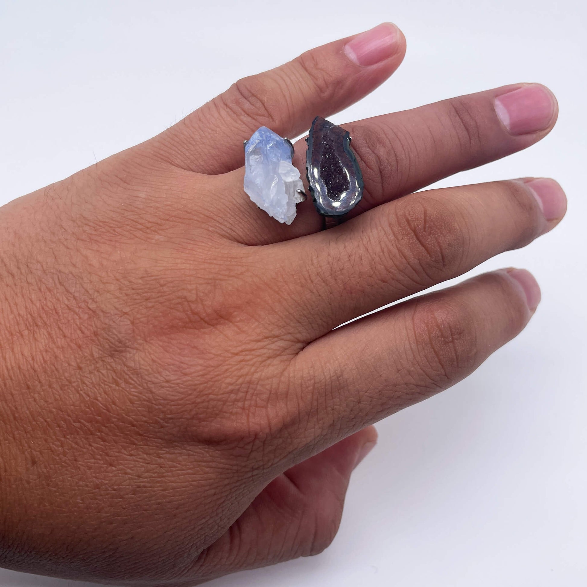 The main stones of the ring are dark brown agate geode and light blue crystal. The ring setting is made of alloy.