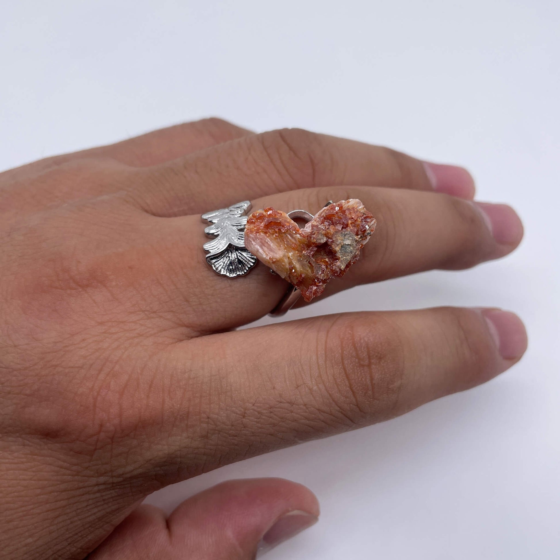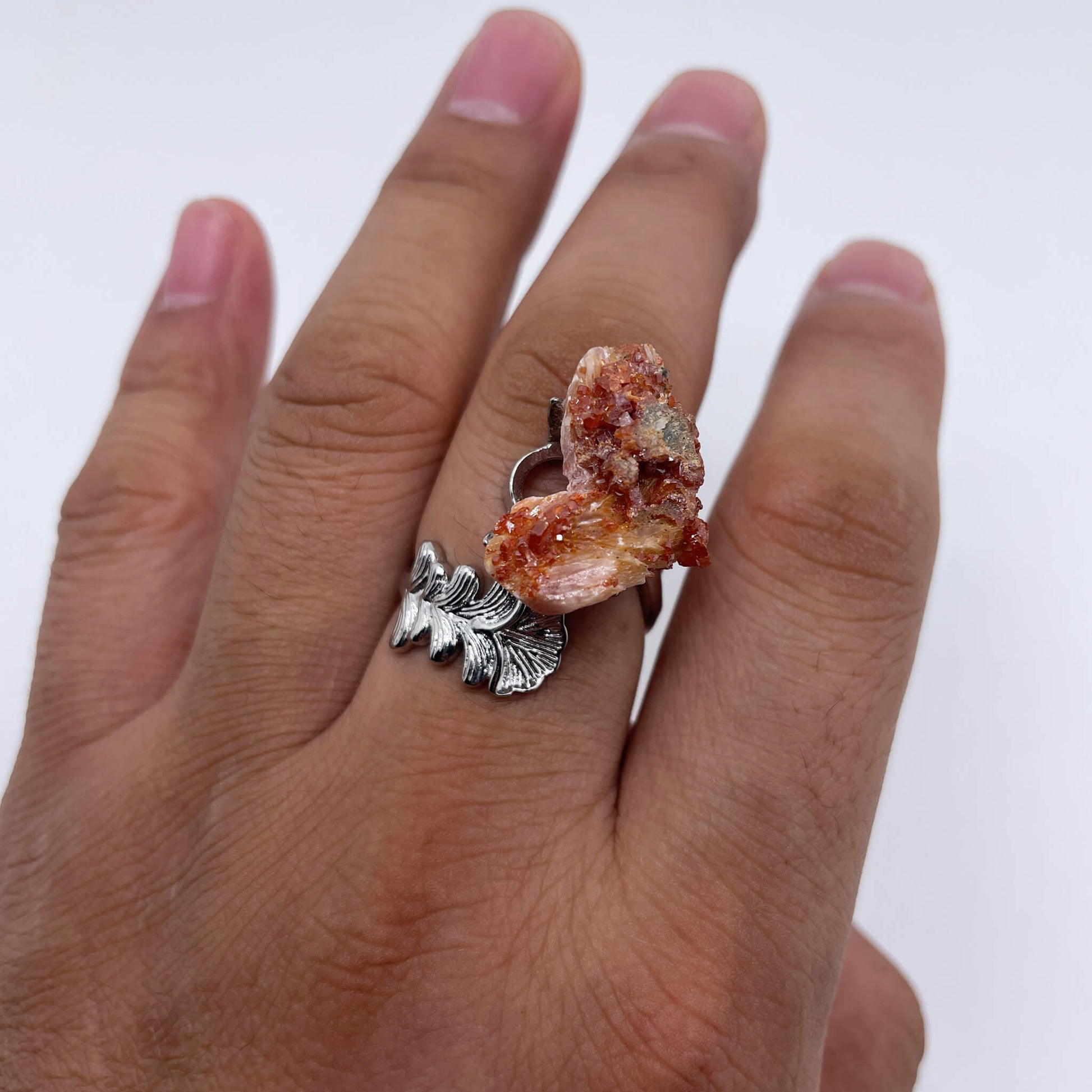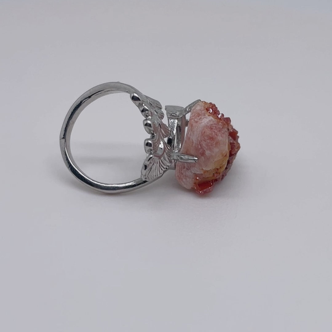 The main body of the ring is a red crystal raw stone, and the ring setting is made of alloy.