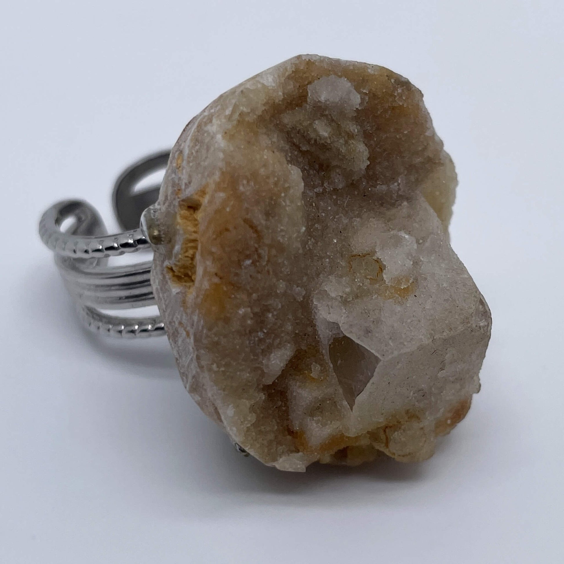 The main body of the ring is yellow calcite, and the ring setting is made of alloy. The rough stone retains its natural blocky and crystalline texture, presenting a simple and thick texture.