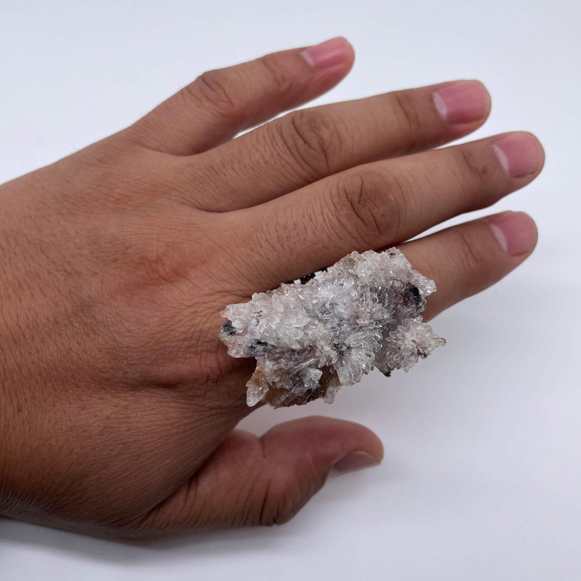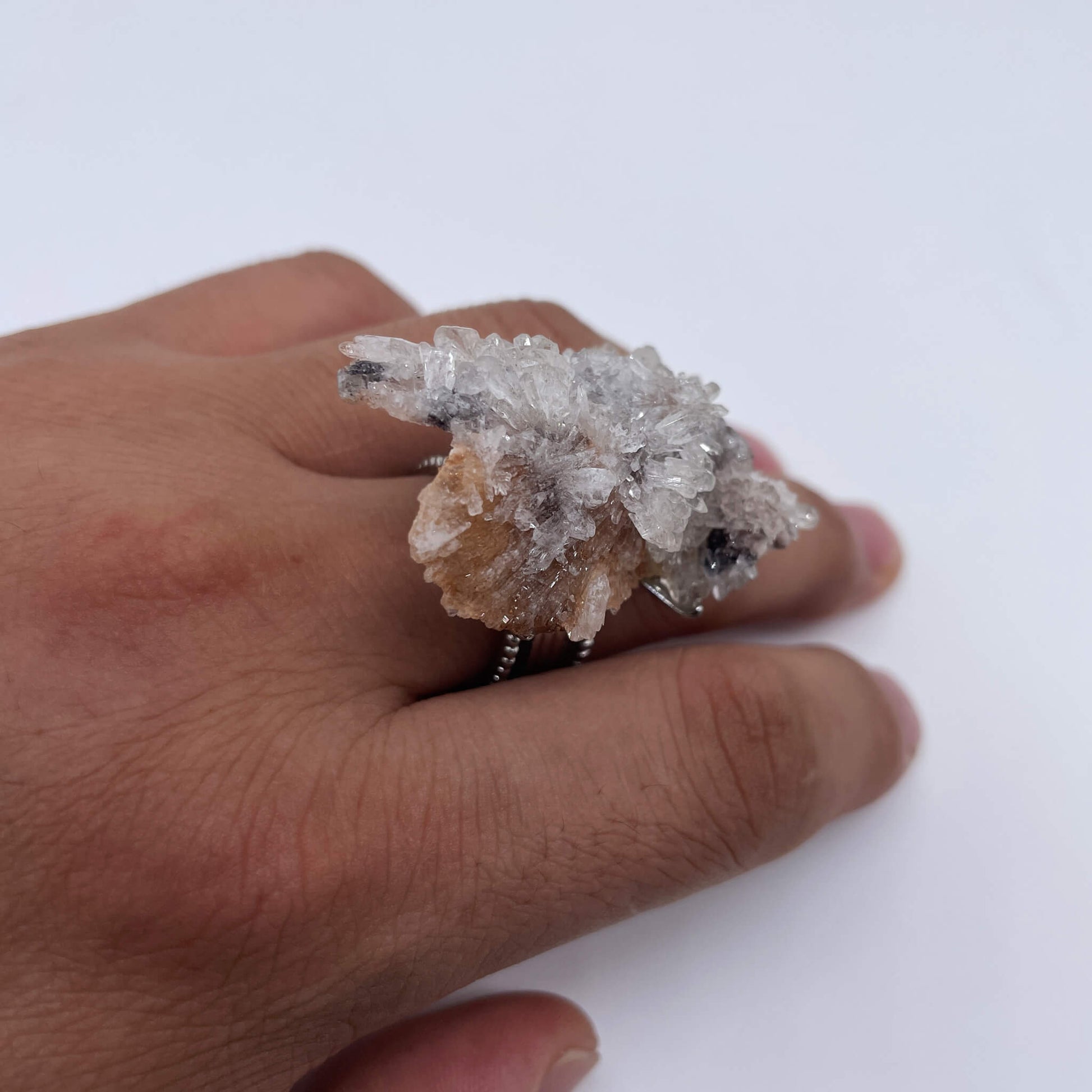 The main body of the ring is made of white crystal cluster rough stone (naturally formed into a cicada-shaped cluster crystal with a small amount of dark mineral impurities), and the ring setting is made of alloy. The rough stone retains its natural cicada-shaped cluster crystal structure, with a transparent texture and a sense of natural artistry.