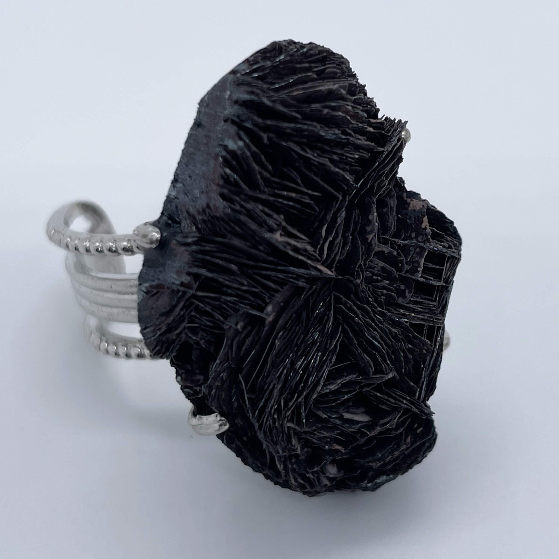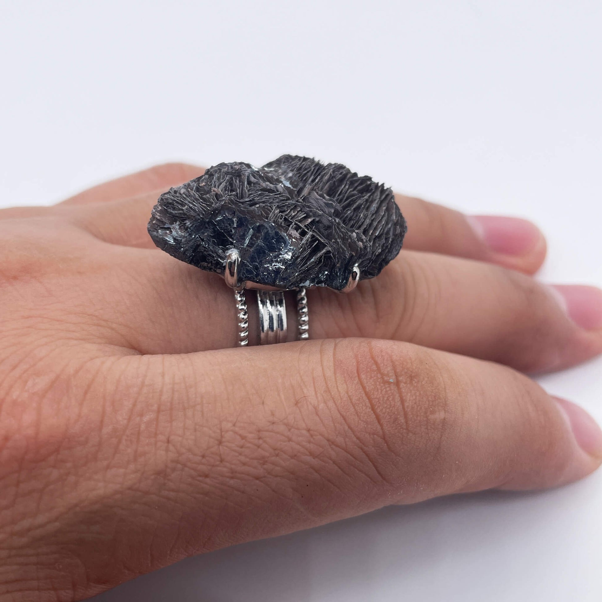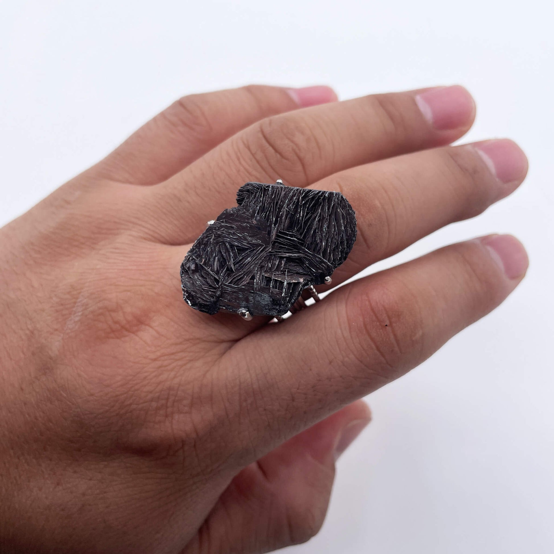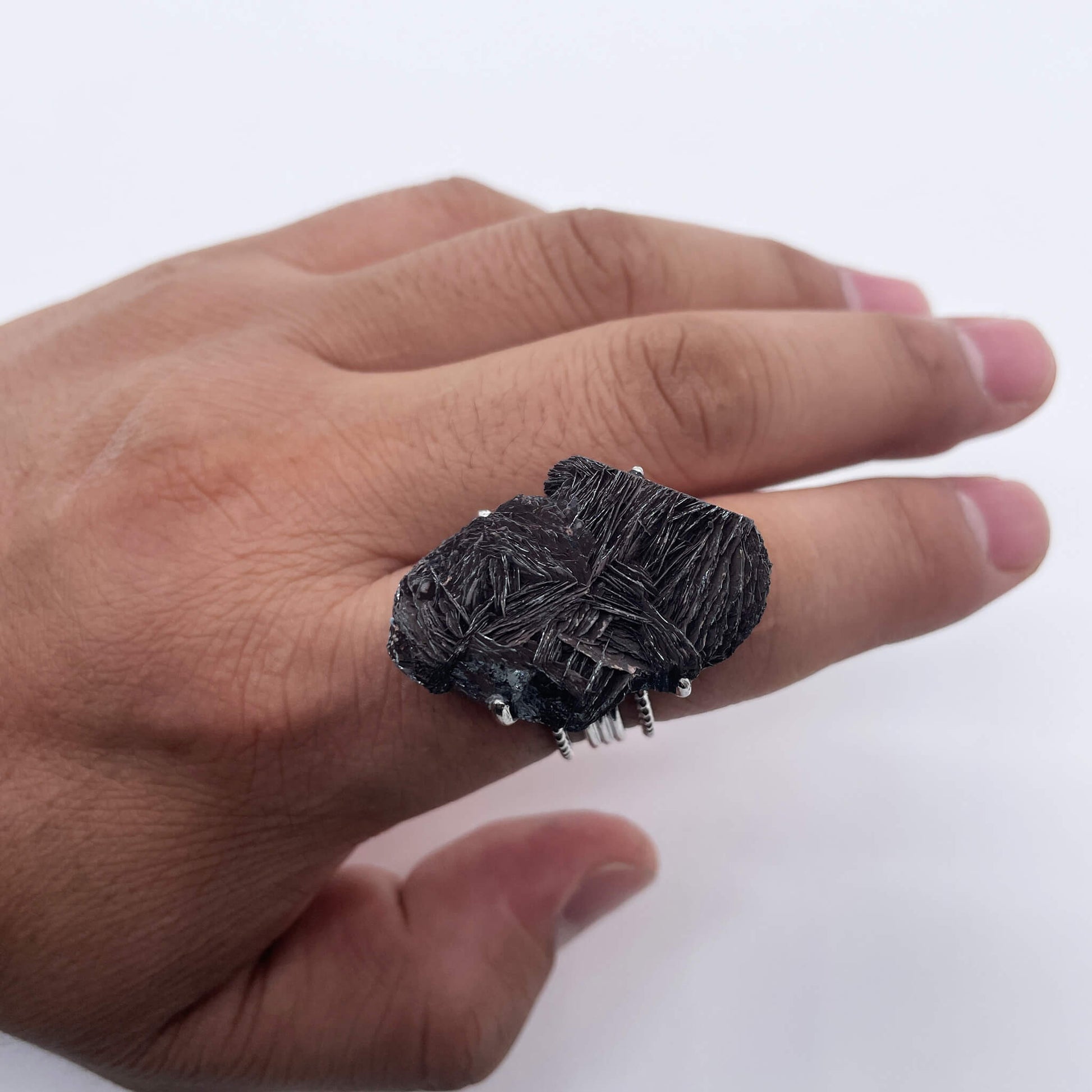 The main body of the ring is a raw stone of black tourmaline (needle-like tourmaline), and the ring setting is made of alloy.