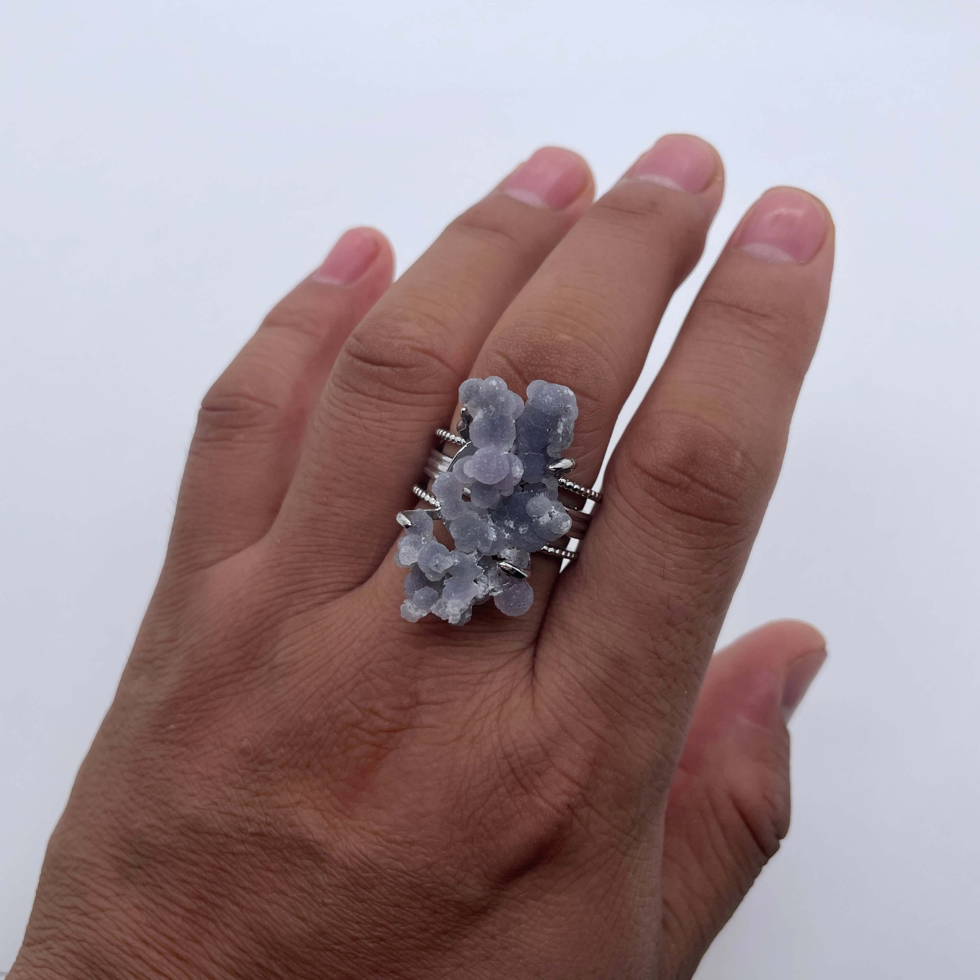 On the whole, it symbolizes the gift of nature and the bearing of beautiful images. The light blue raw stone conveys a sense of tranquility and freshness. The unique shape of the raw stone is like an artistic crystallization of nature. Wearing it can symbolize the love and pursuit of natural beauty, and also implies that one can maintain a pure and unique self like a crystal in life, while having hazy, dreamy, beautiful and precious expectations and yearnings.