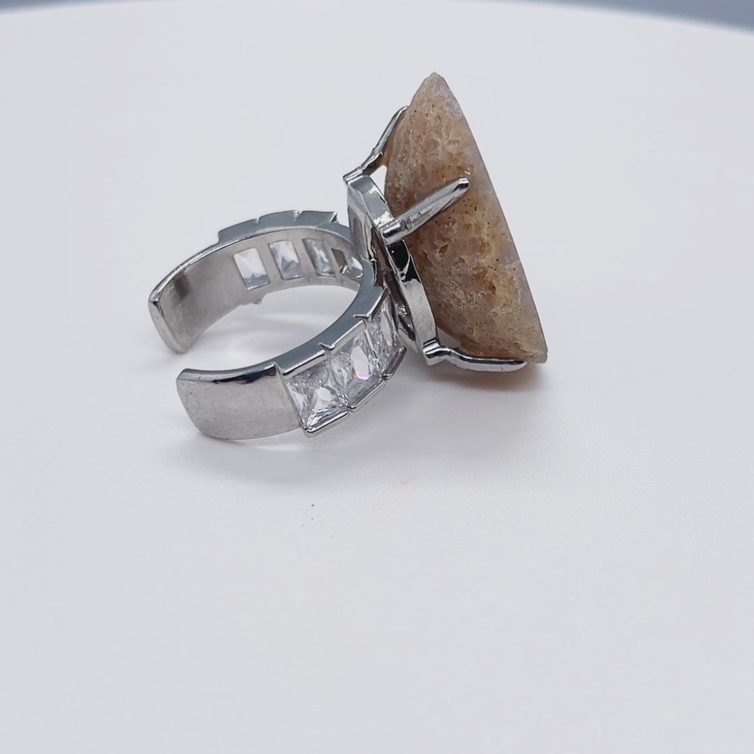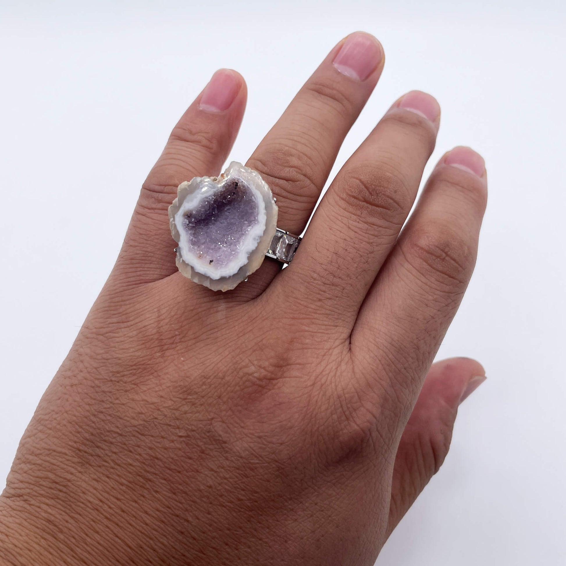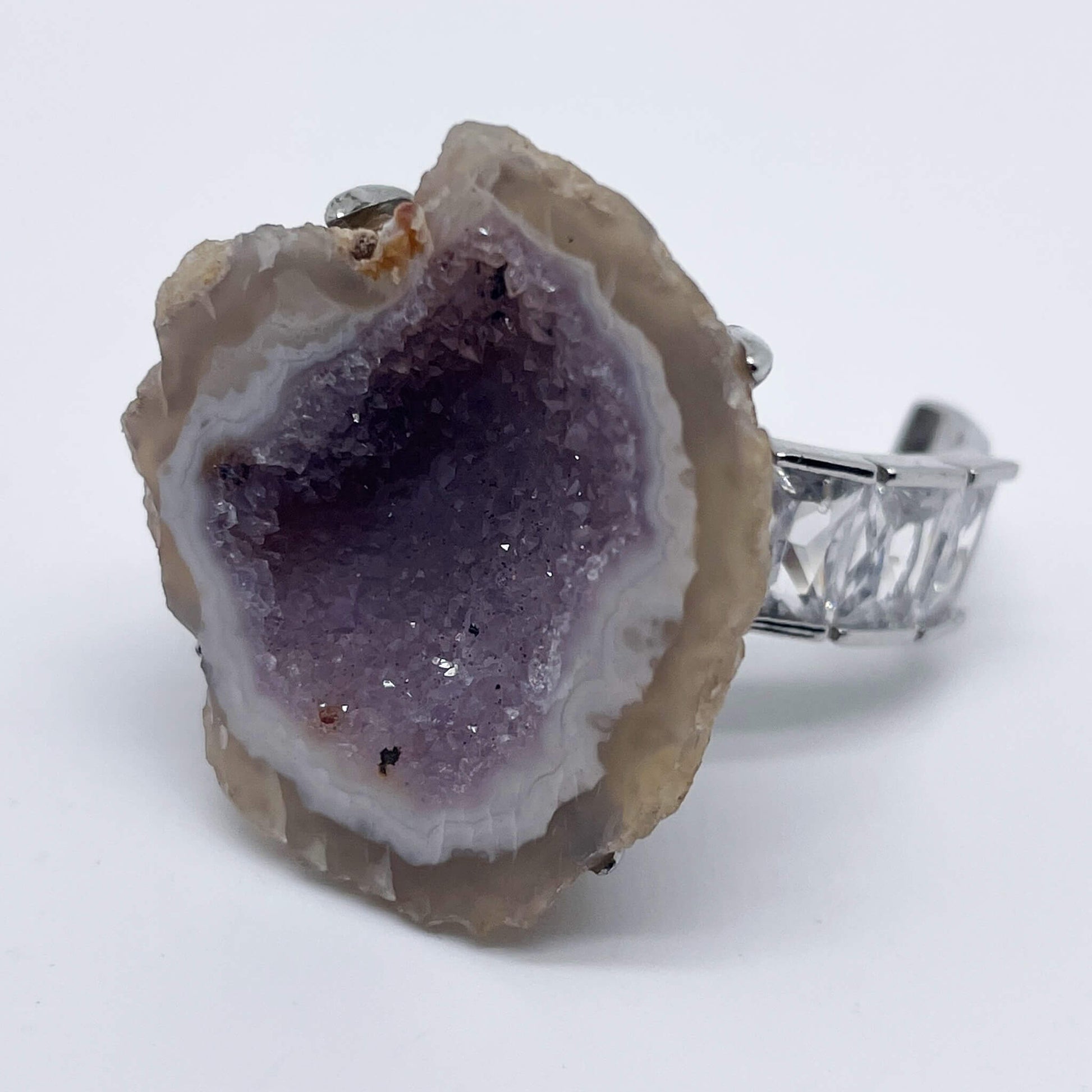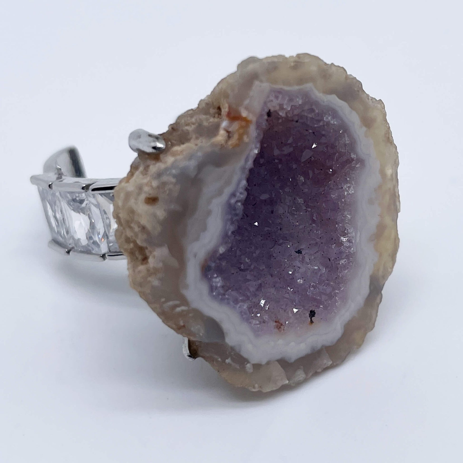 The main body of the ring is a raw stone of amethyst geode (with agate edge), and the ring setting is made of alloy.