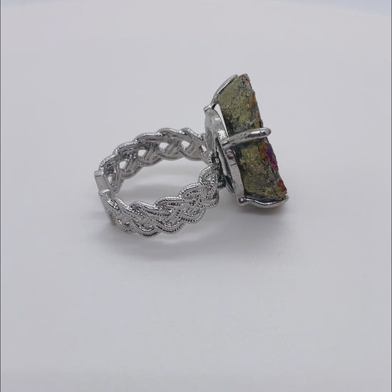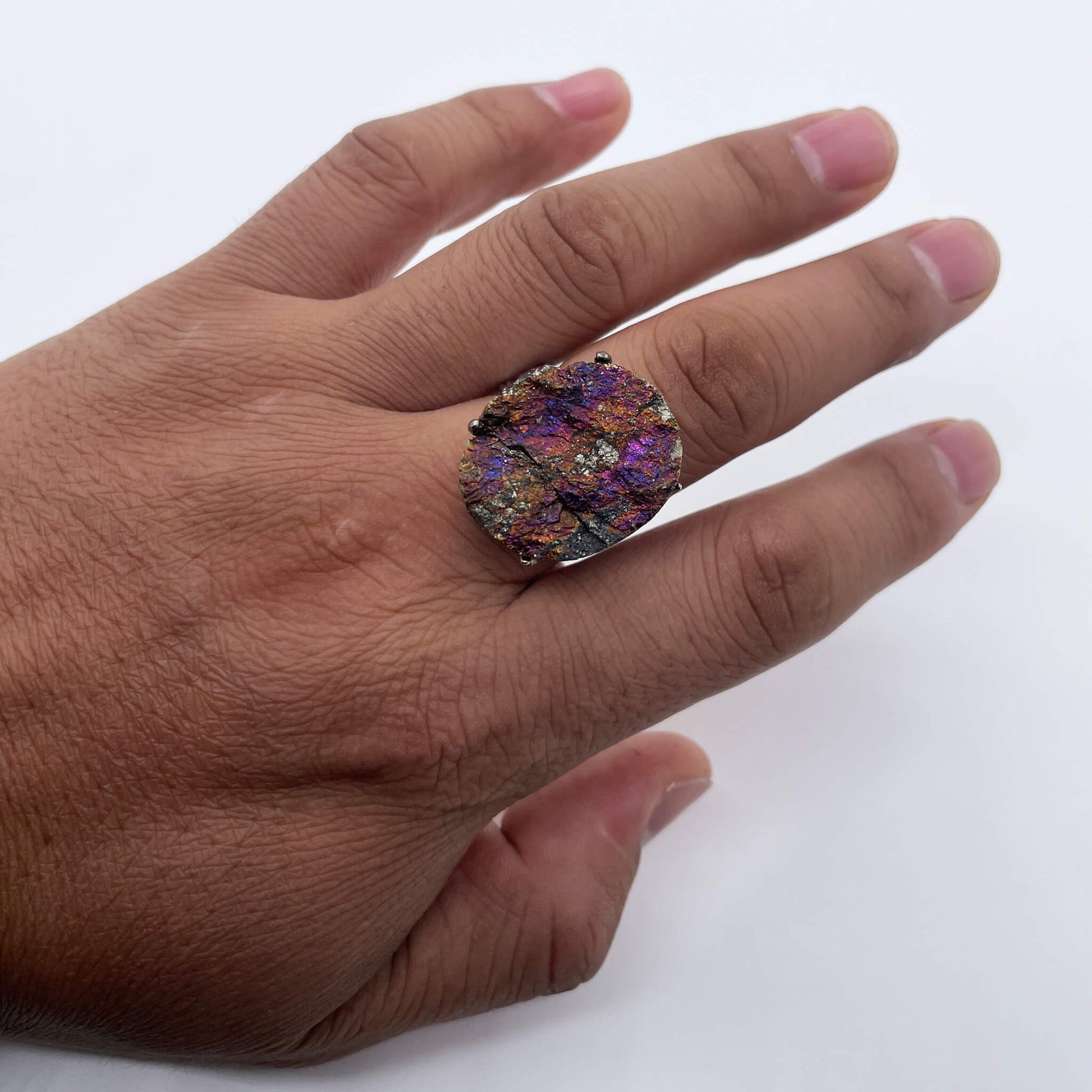 Bornite symbolizes transformation, inspiration, and mysterious power. Its changing iridescent colors are like the diverse possibilities of life, implying that the wearer can constantly transform in growth, inspire infinite inspiration, and at the same time, safeguard their unique inner pursuits with its mysterious energy, creating extraordinariness in the ordinary. The toughness of the alloy symbolizes stability and durability. Combined with bornite, it not only retains the natural fantasy of the raw stone but also conveys the adherence to personal style through the texture of the alloy. Overall, the ring carries beautiful hopes for self-expression, burst of inspiration, and life transformation.