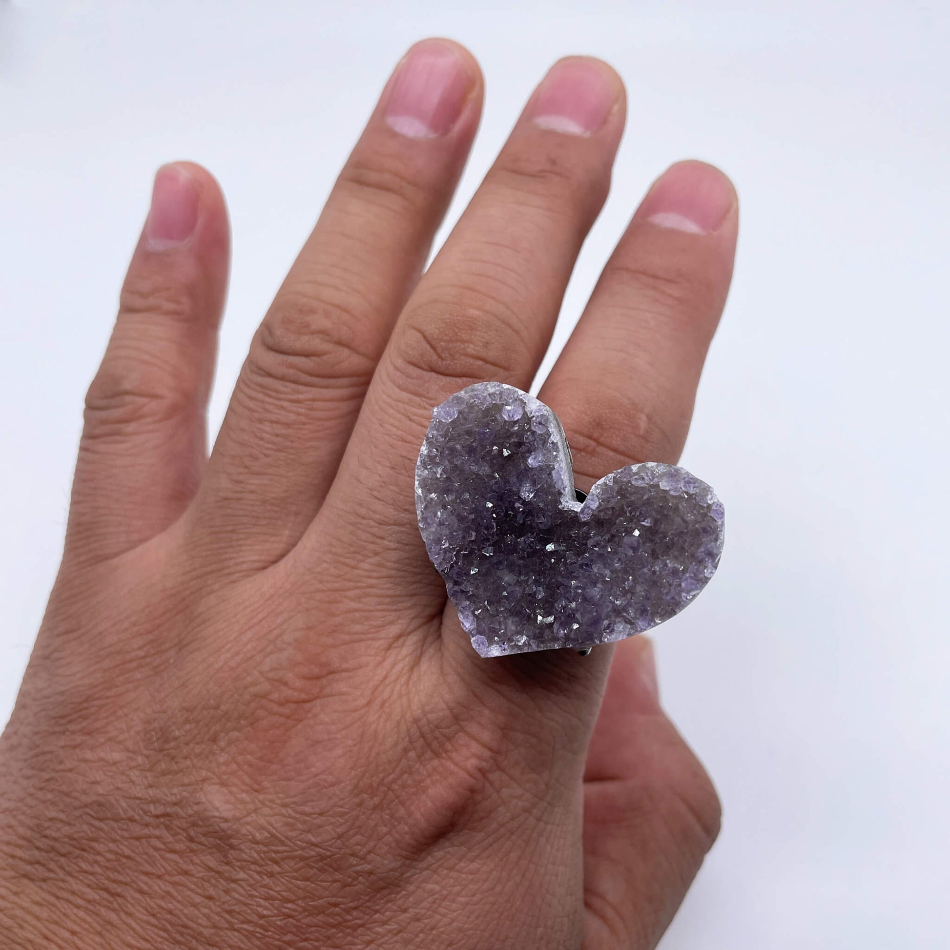 From the perspective of natural aesthetics, the heart-shaped amethyst cluster is a combination of nature and craftsmanship. The arrangement of each crystal cluster is unique, representing an exclusive emotional imprint. It implies that the wearer's emotions and personality are as unique as this ring, not following the crowd, and possessing exclusive romance and charm.