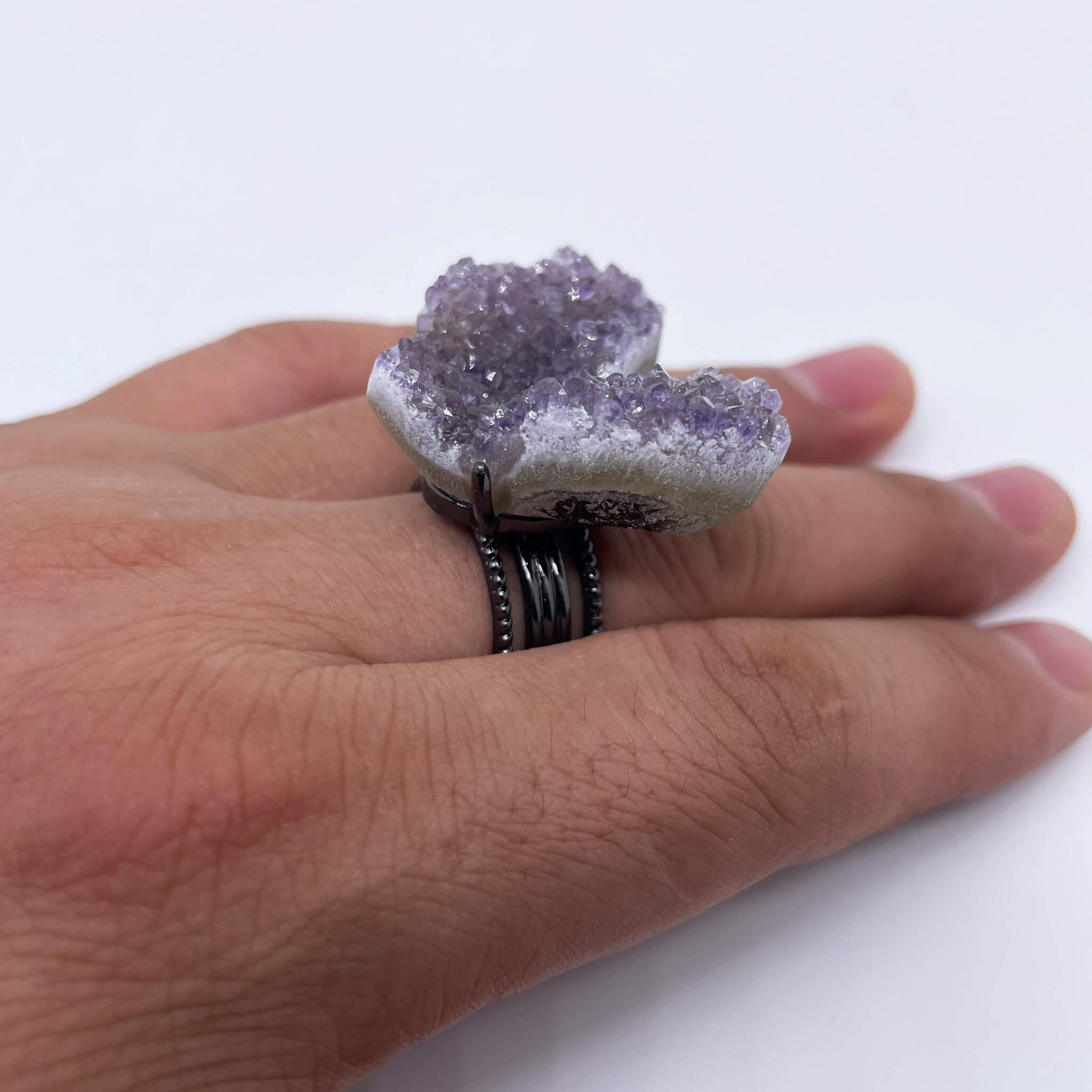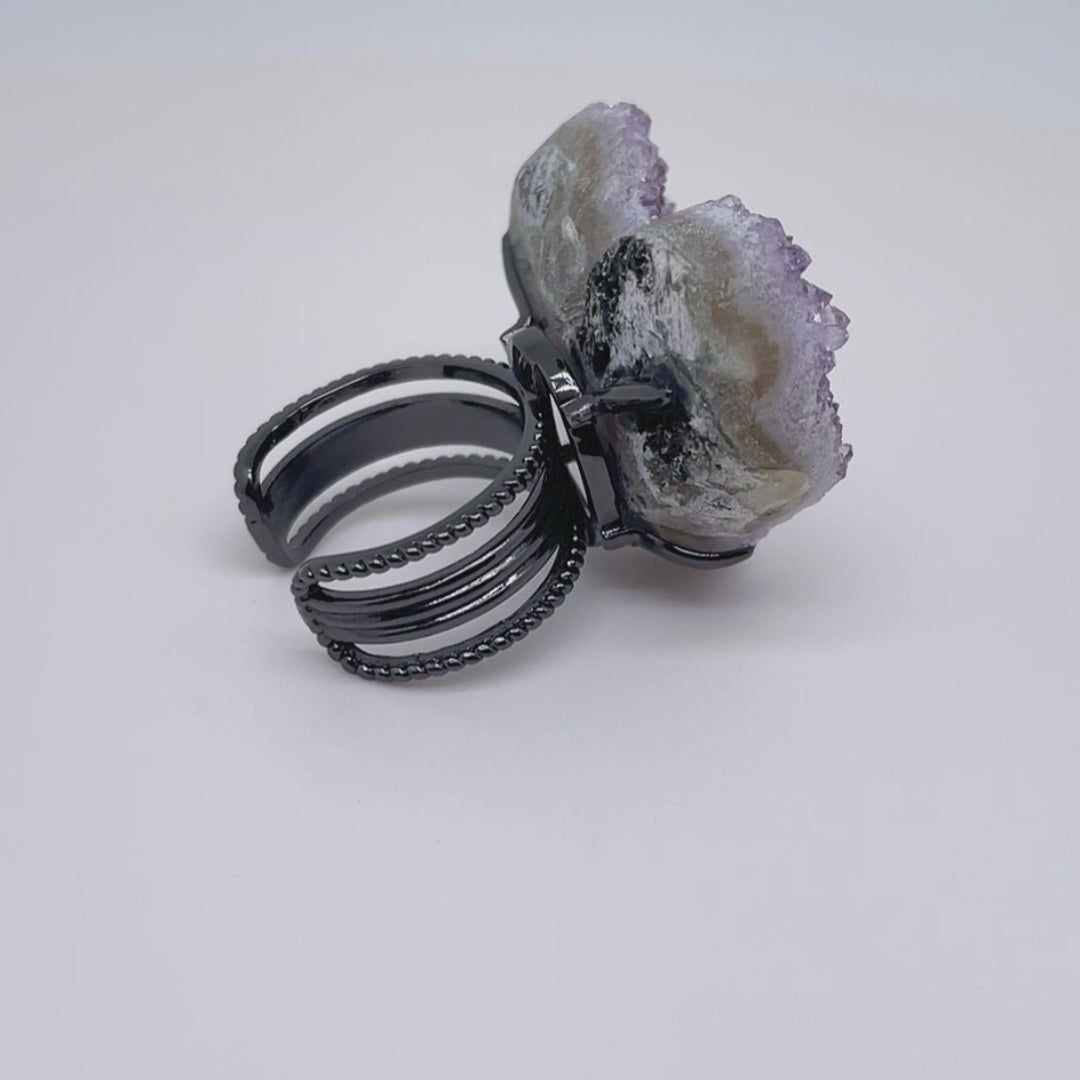 The main stone of the ring is a raw amethyst cluster, and the ring setting is made of alloy.