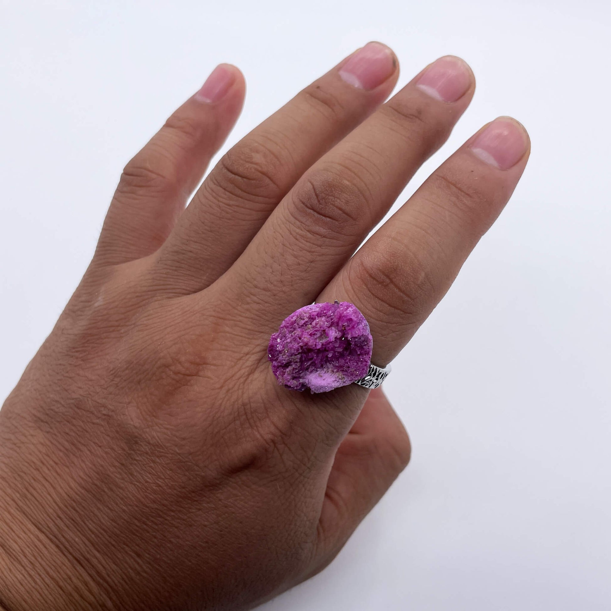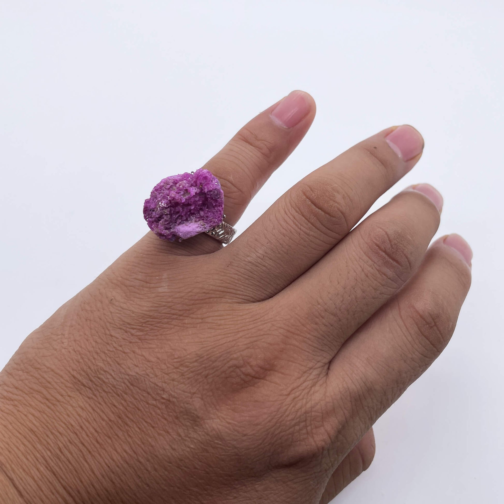 It is inlaid with natural purple raw stone, and the ring setting is made of metal alloy.