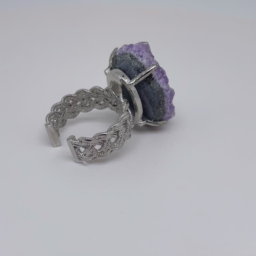 The main stone of the ring is a raw amethyst cluster, and the ring setting is made of alloy.
