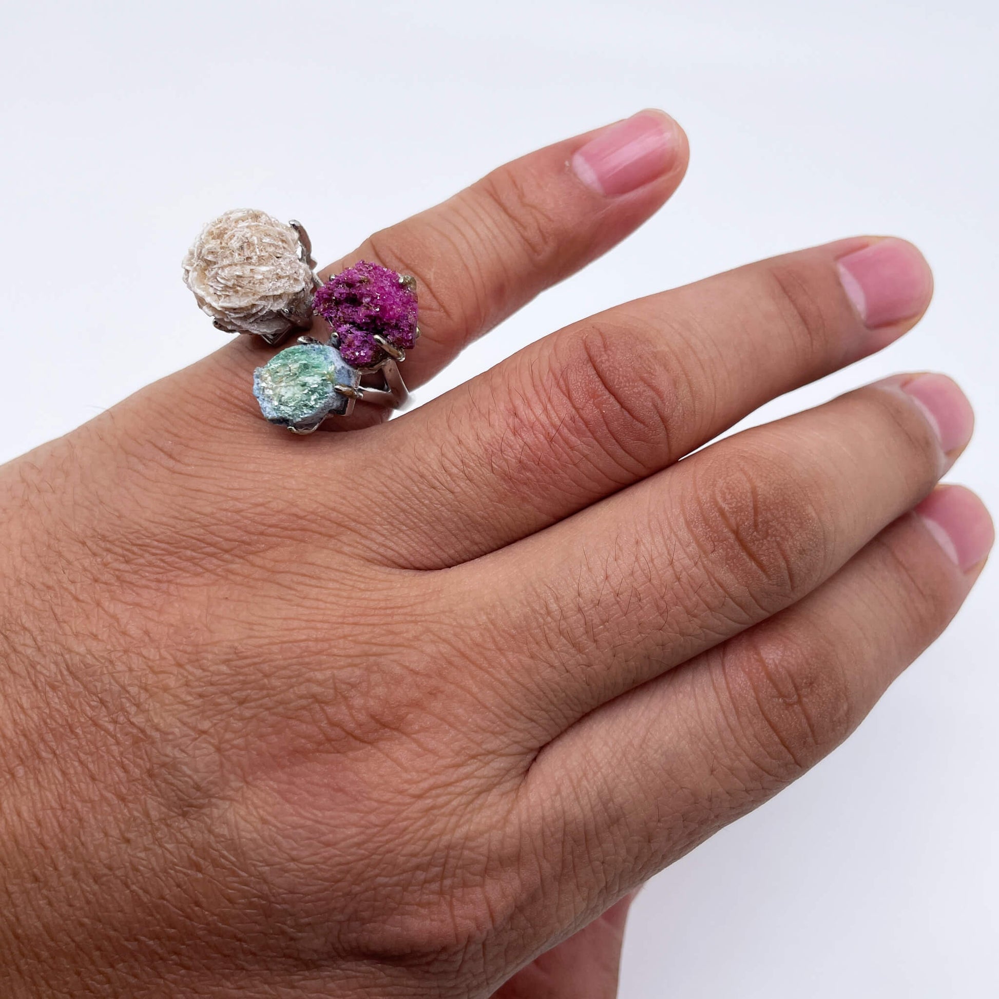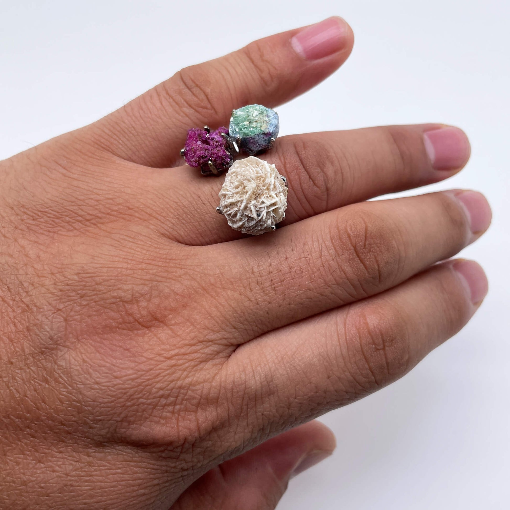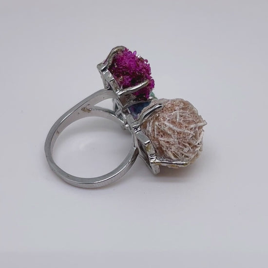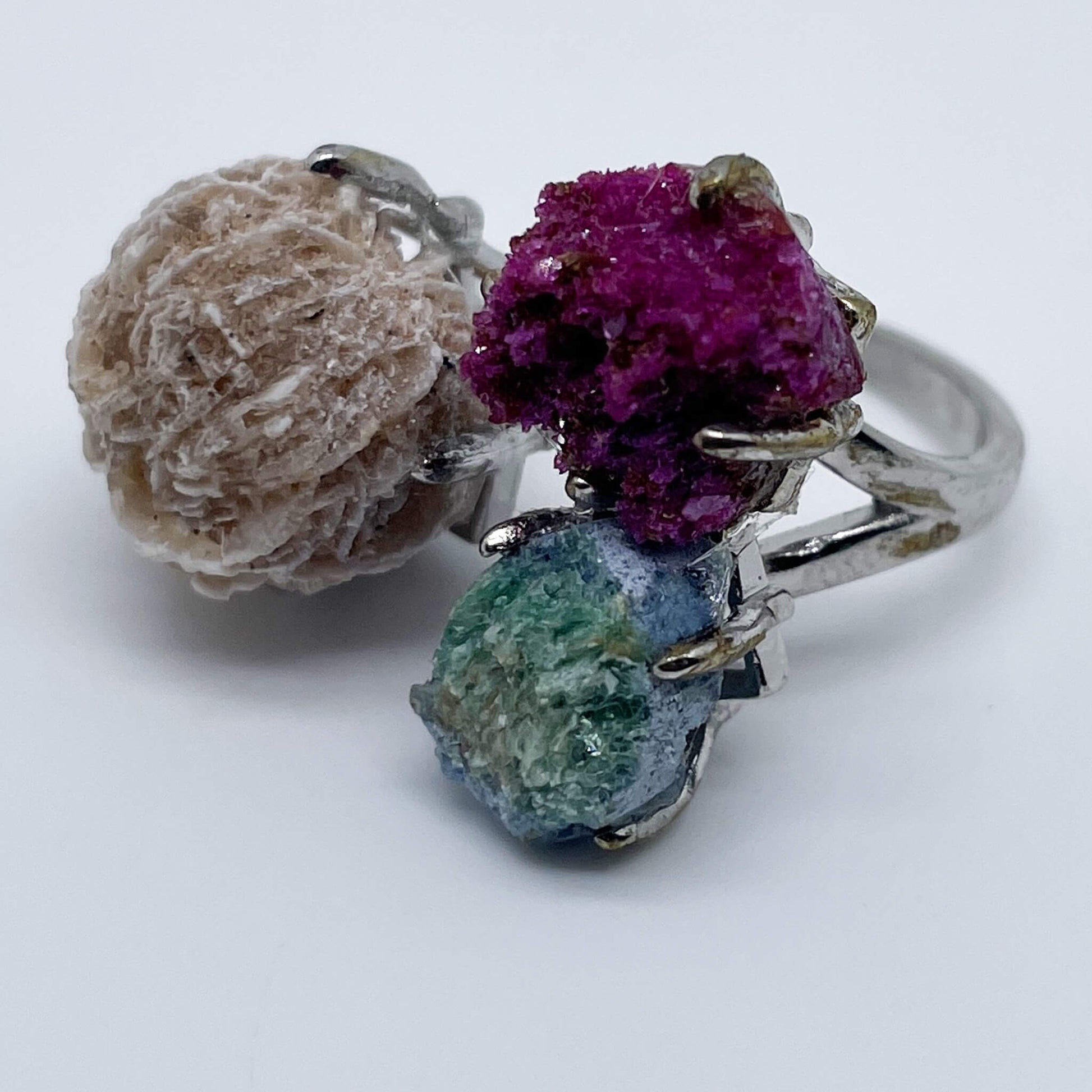 The main stones of the ring are desert rose stone, purple-red crystal cluster, and green-blue crystal. The ring setting is made of alloy.