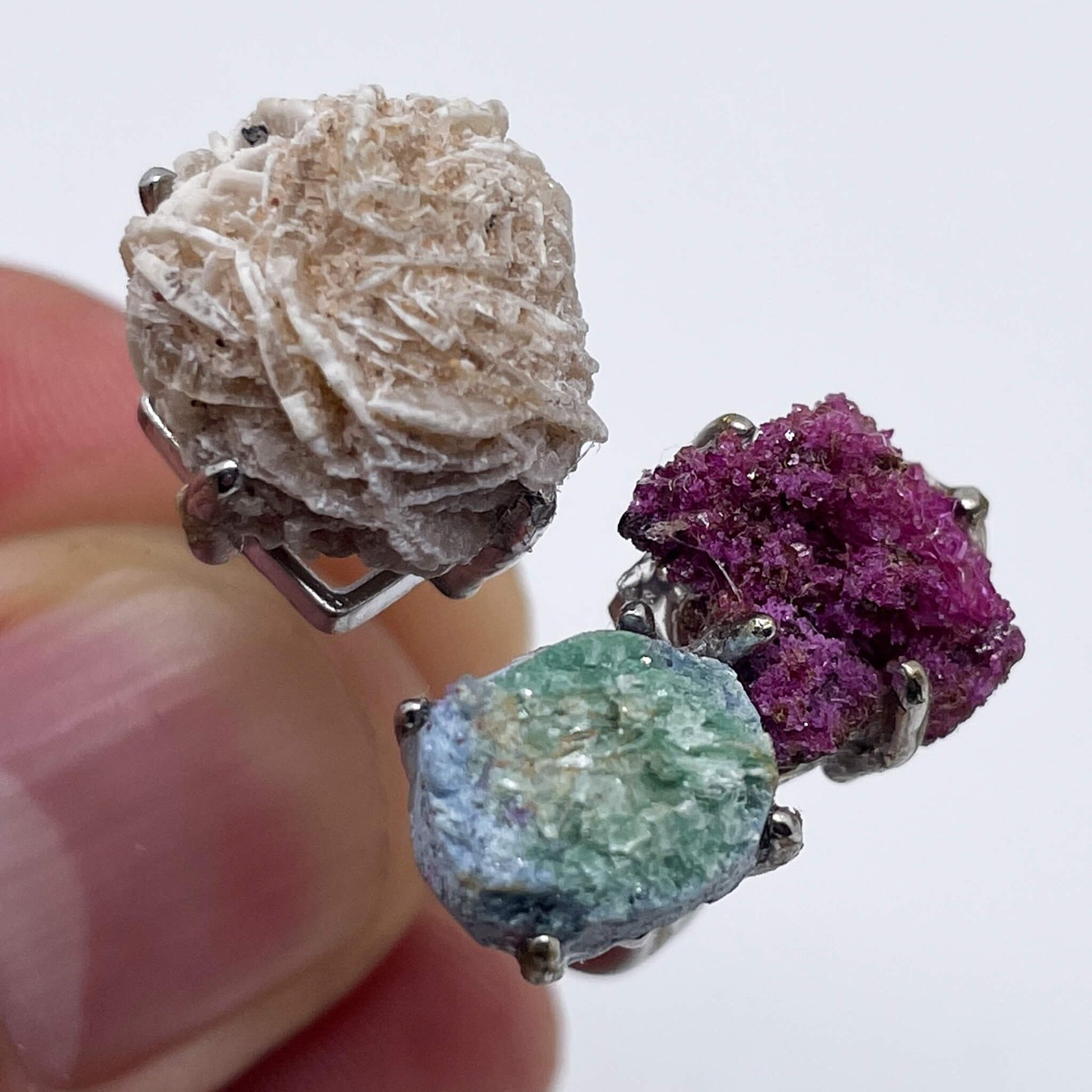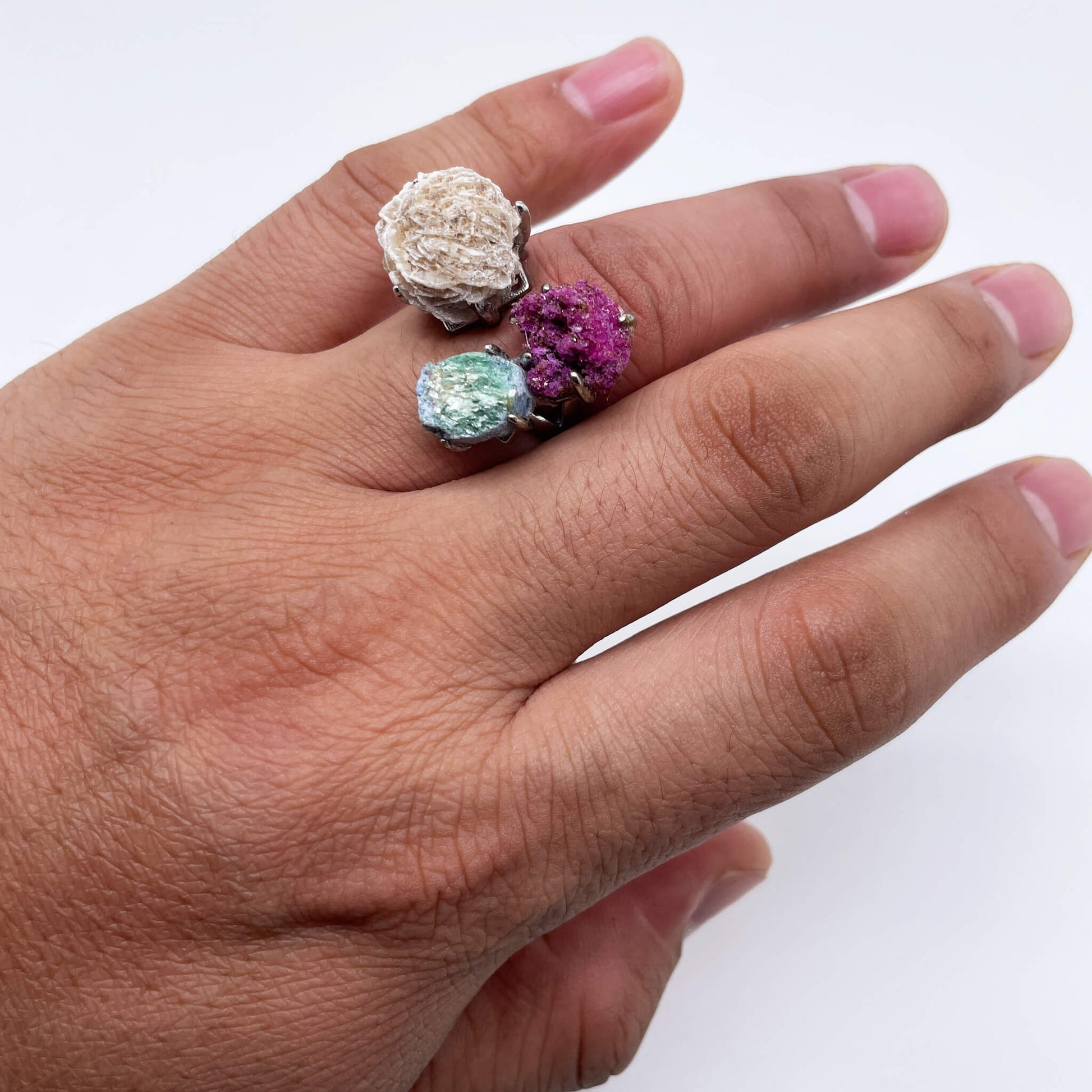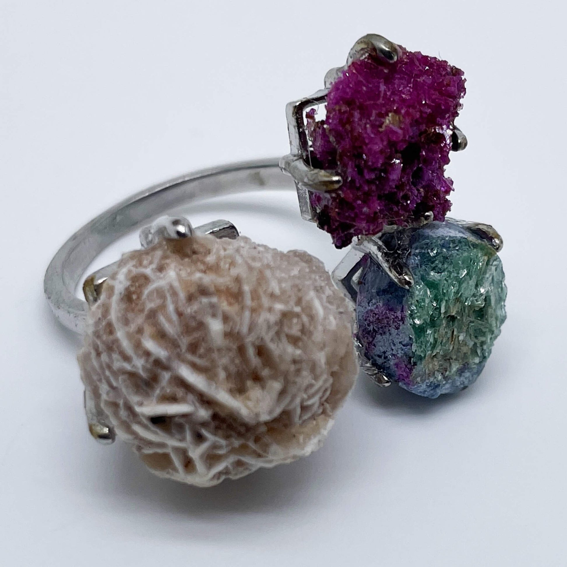 The main stones of the ring are desert rose stone, purple-red crystal cluster, and green-blue crystal. The ring setting is made of alloy.