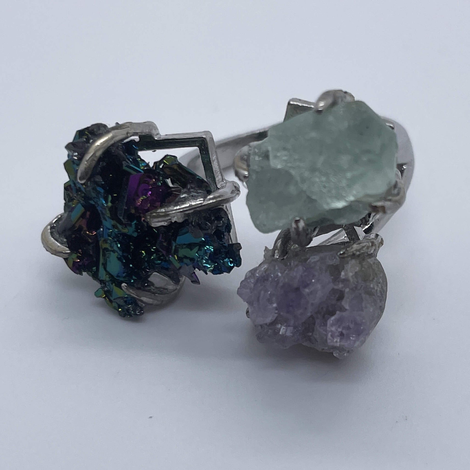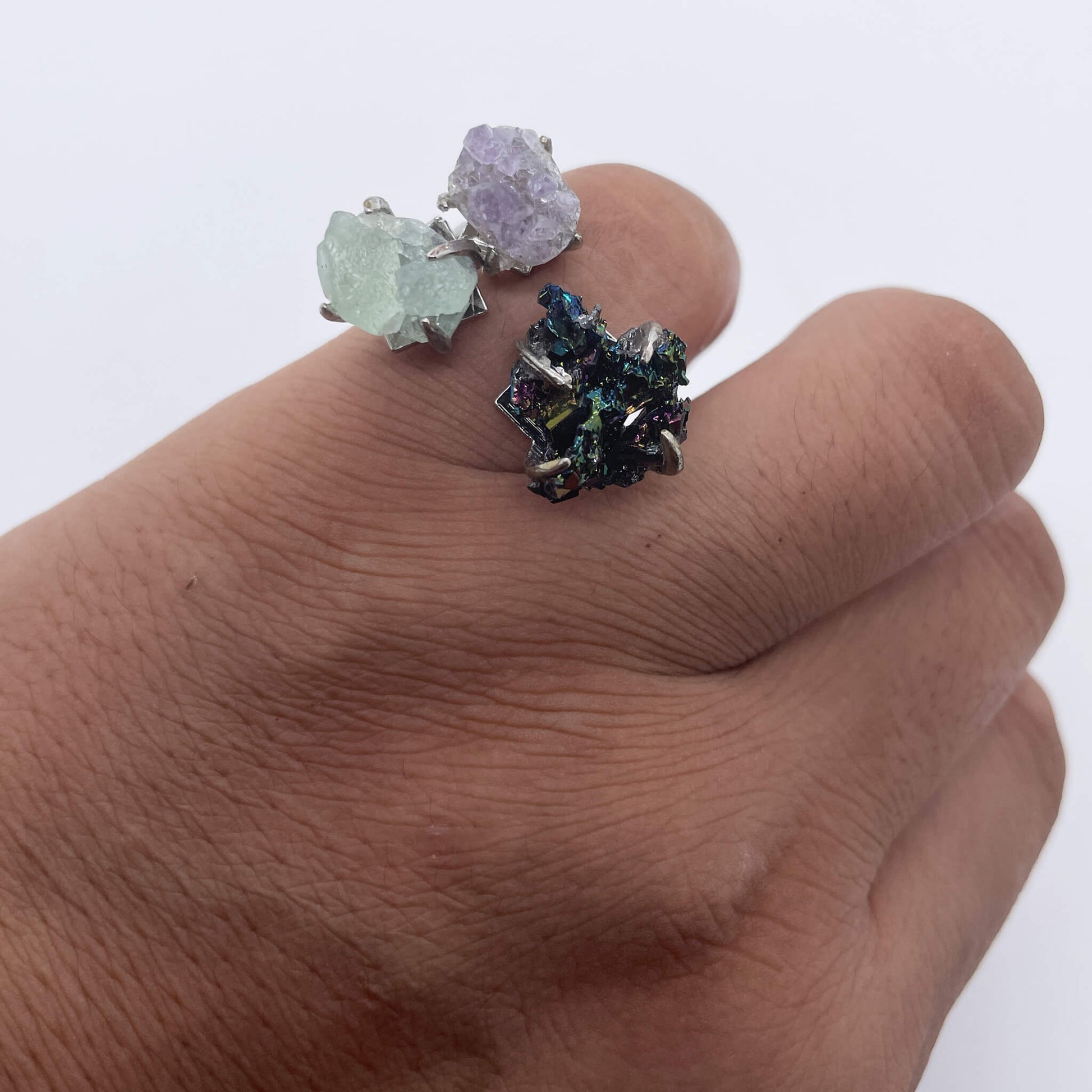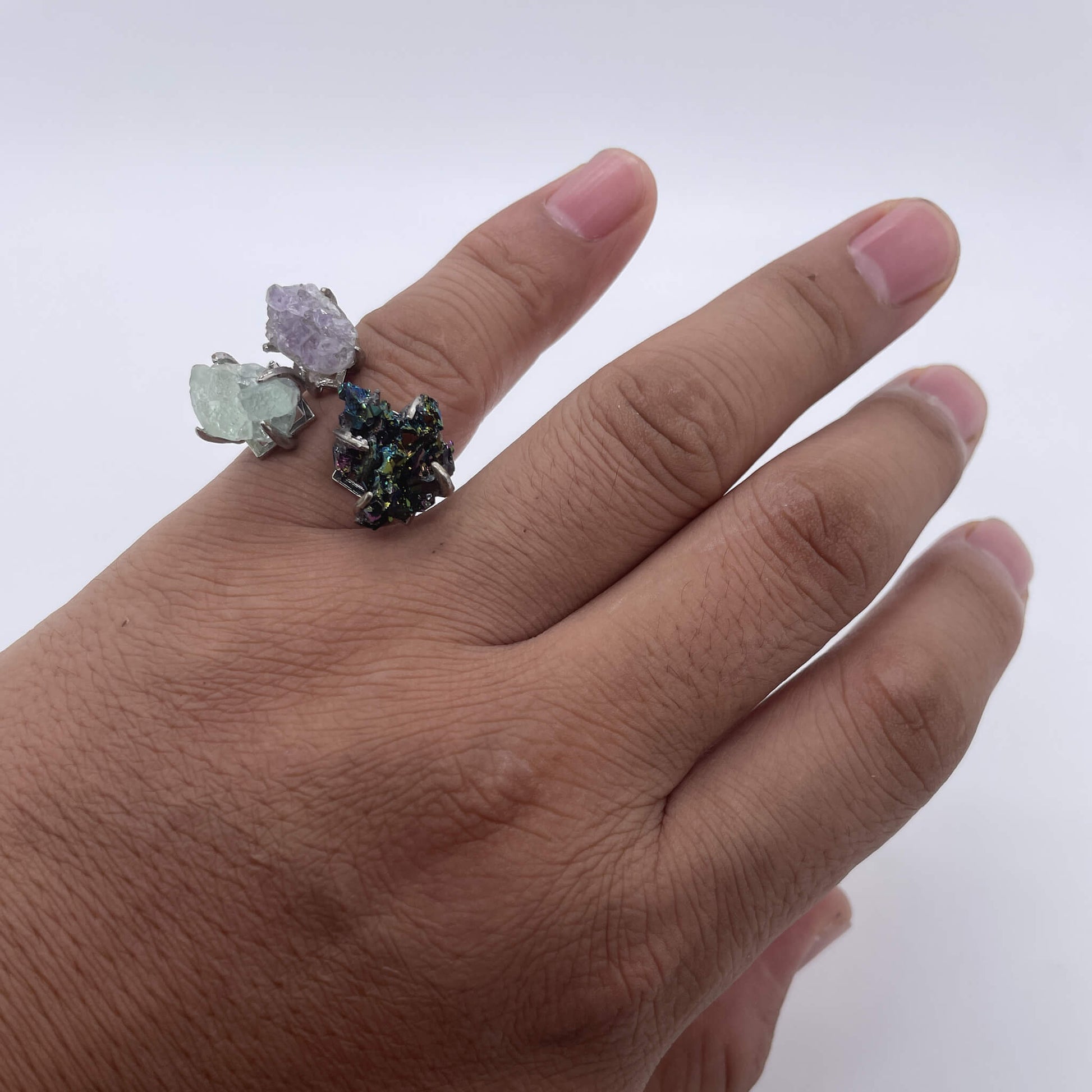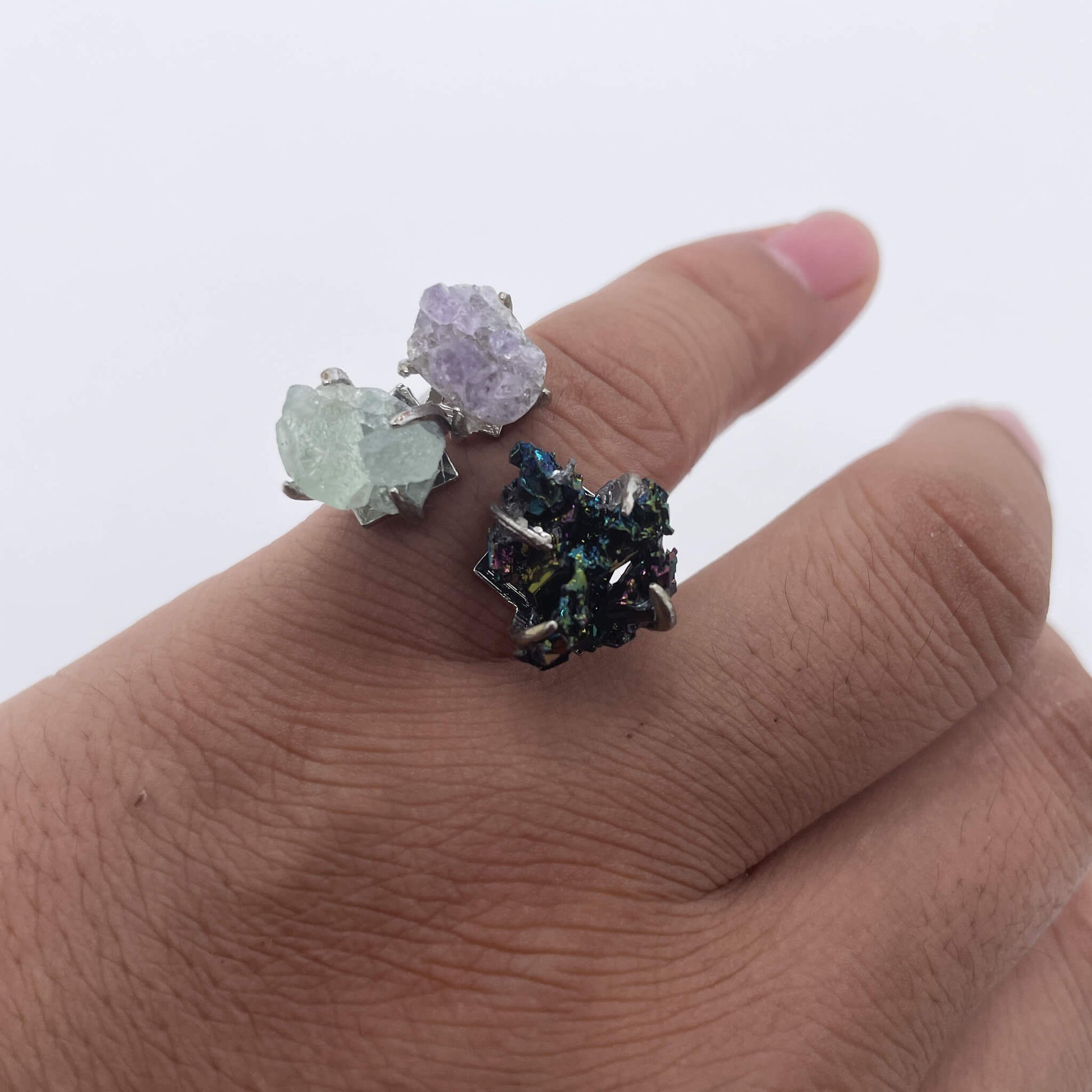 Amethyst often symbolizes spirituality, wisdom, and romantic love; green crystal implies hope, vitality, and the freshness of nature; colorful stones represent a colorful life and infinite possibilities. This ring combines raw stones of three different colors and meanings, connected by a silver ring setting. It not only shows the original beauty and colorful characteristics of natural ores but also integrates the symbolic meanings of each raw stone. It seems to condense beautiful meanings such as spirituality, hope, and a colorful life at the fingertips, bringing wisdom, vitality, and expectations for a colorful and beautiful life to the wearer.
