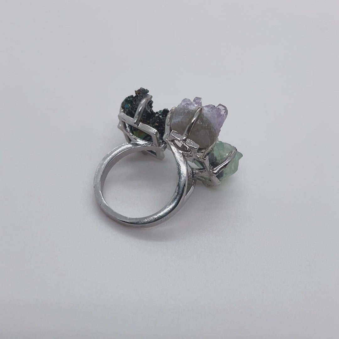 The ring is mainly made of raw amethyst, raw green crystal, colorful stones, and an alloy ring setting.