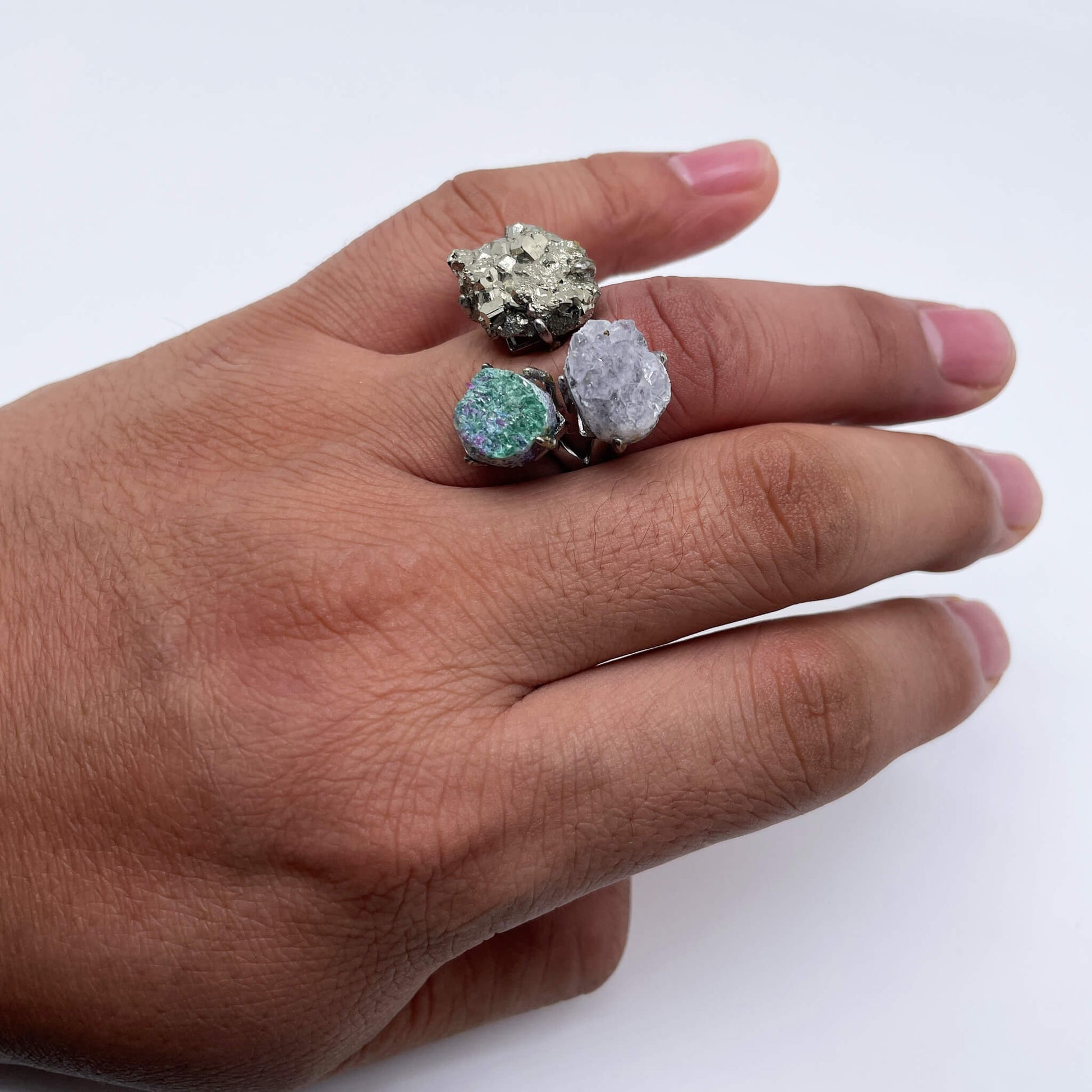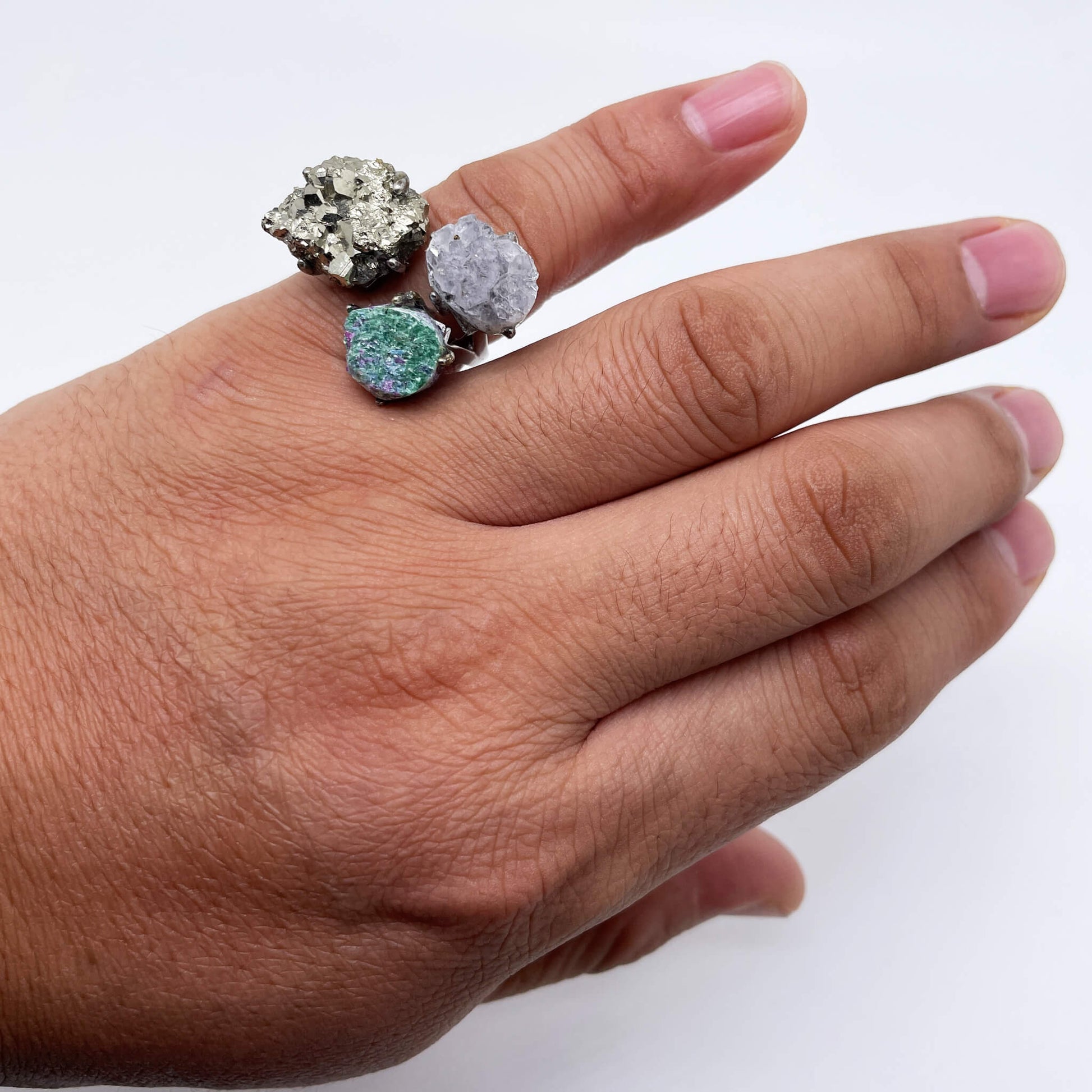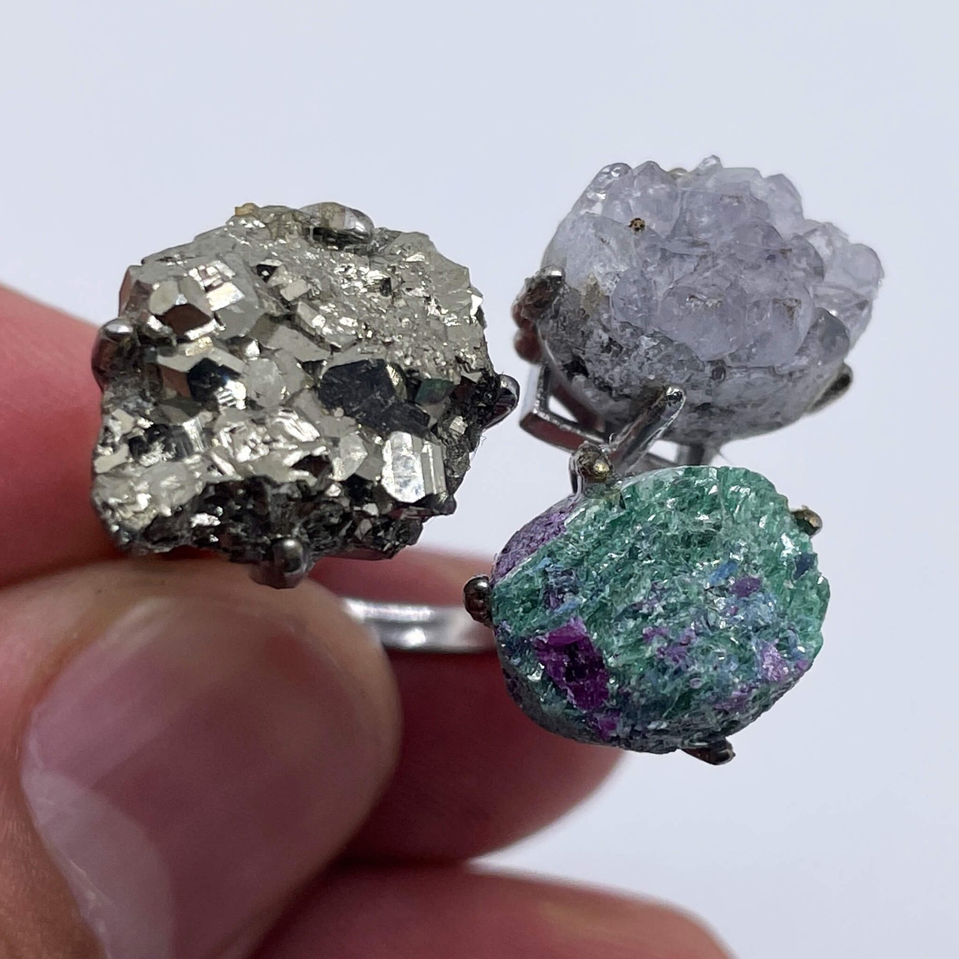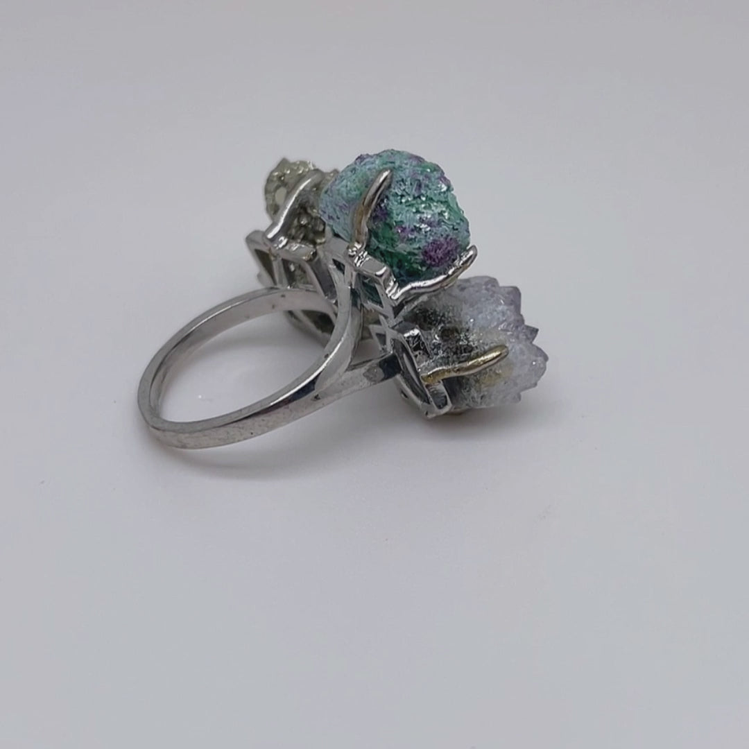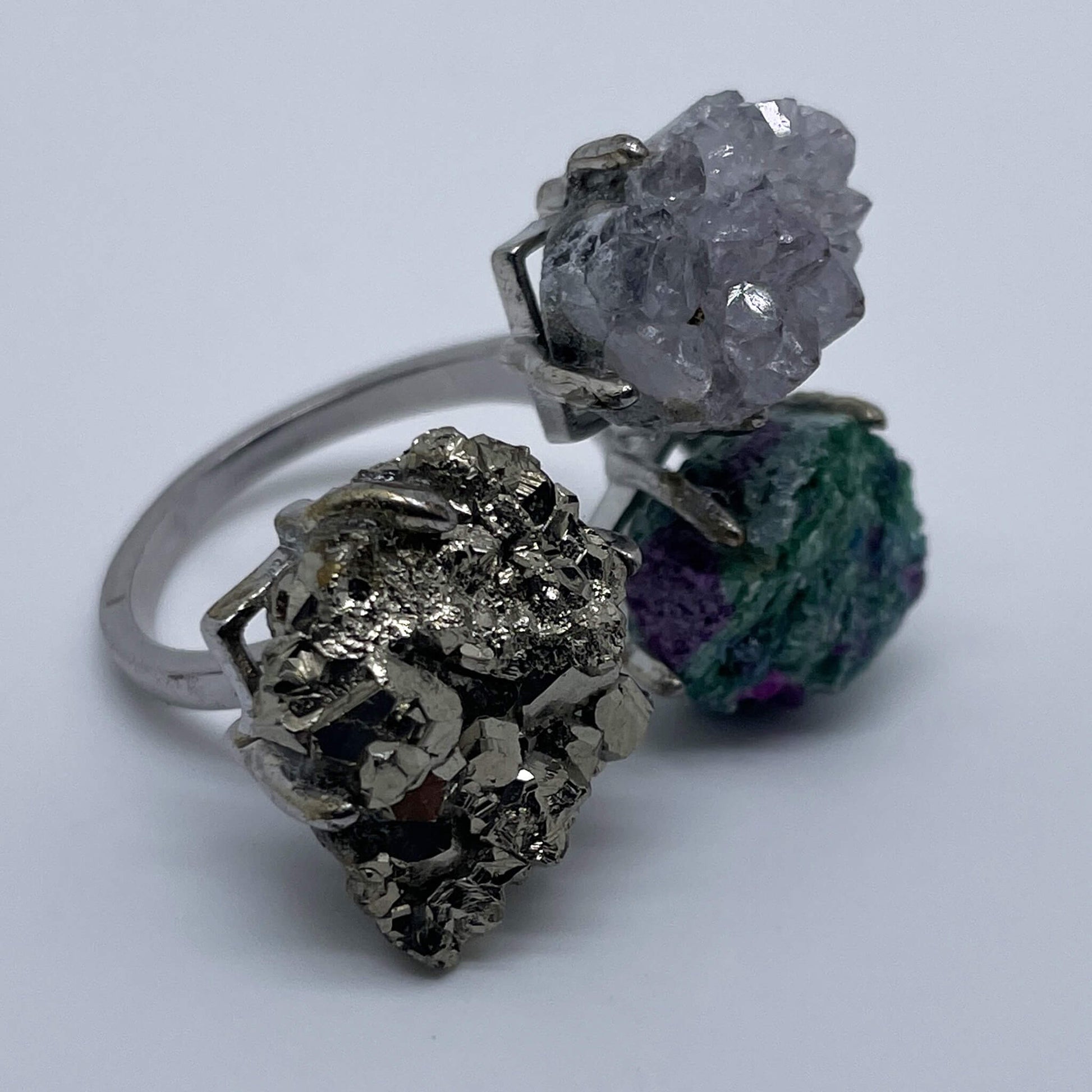 The main stones of the ring are pyrite, light amethyst cluster, and ruby-zoisite raw stone, and the ring setting is made of silver.