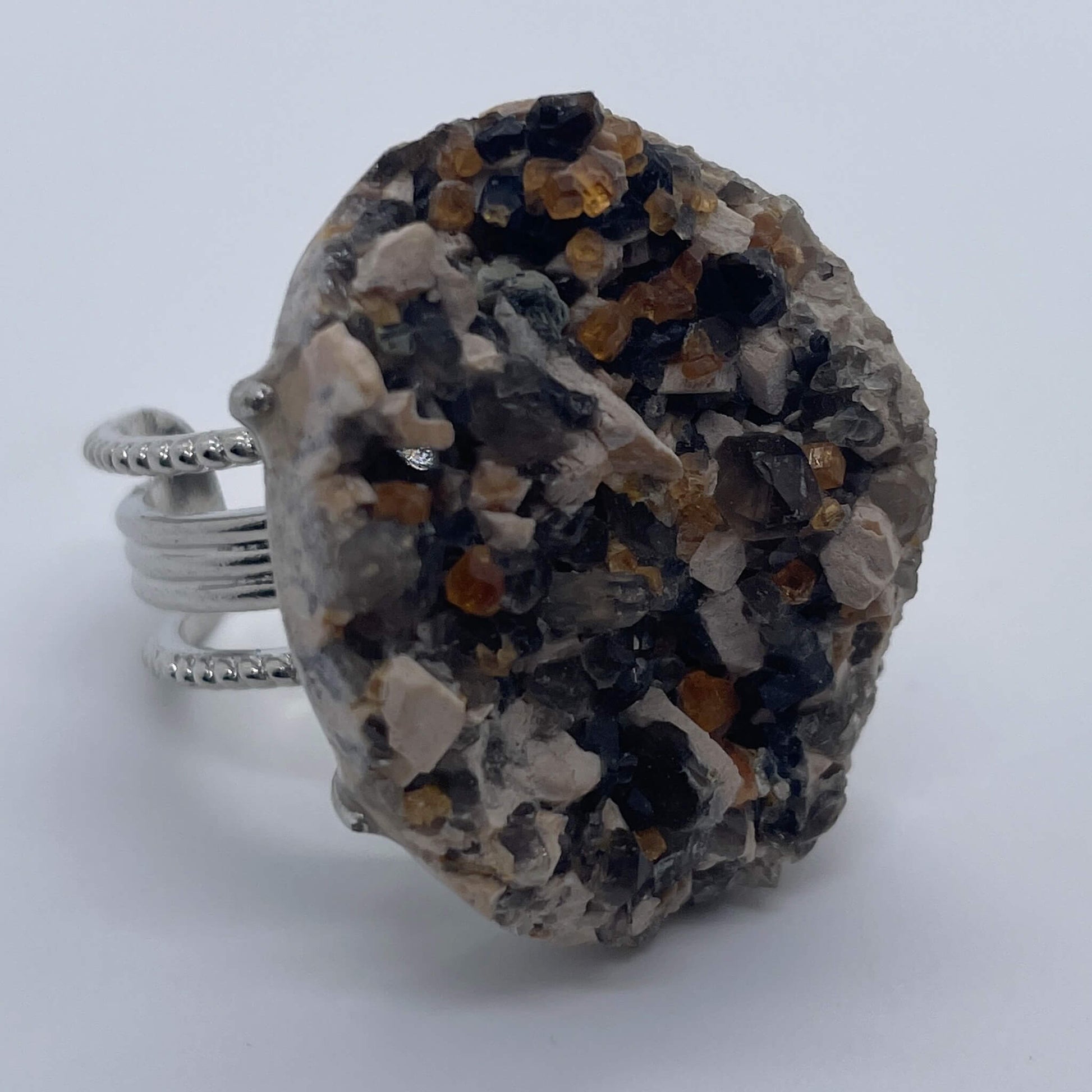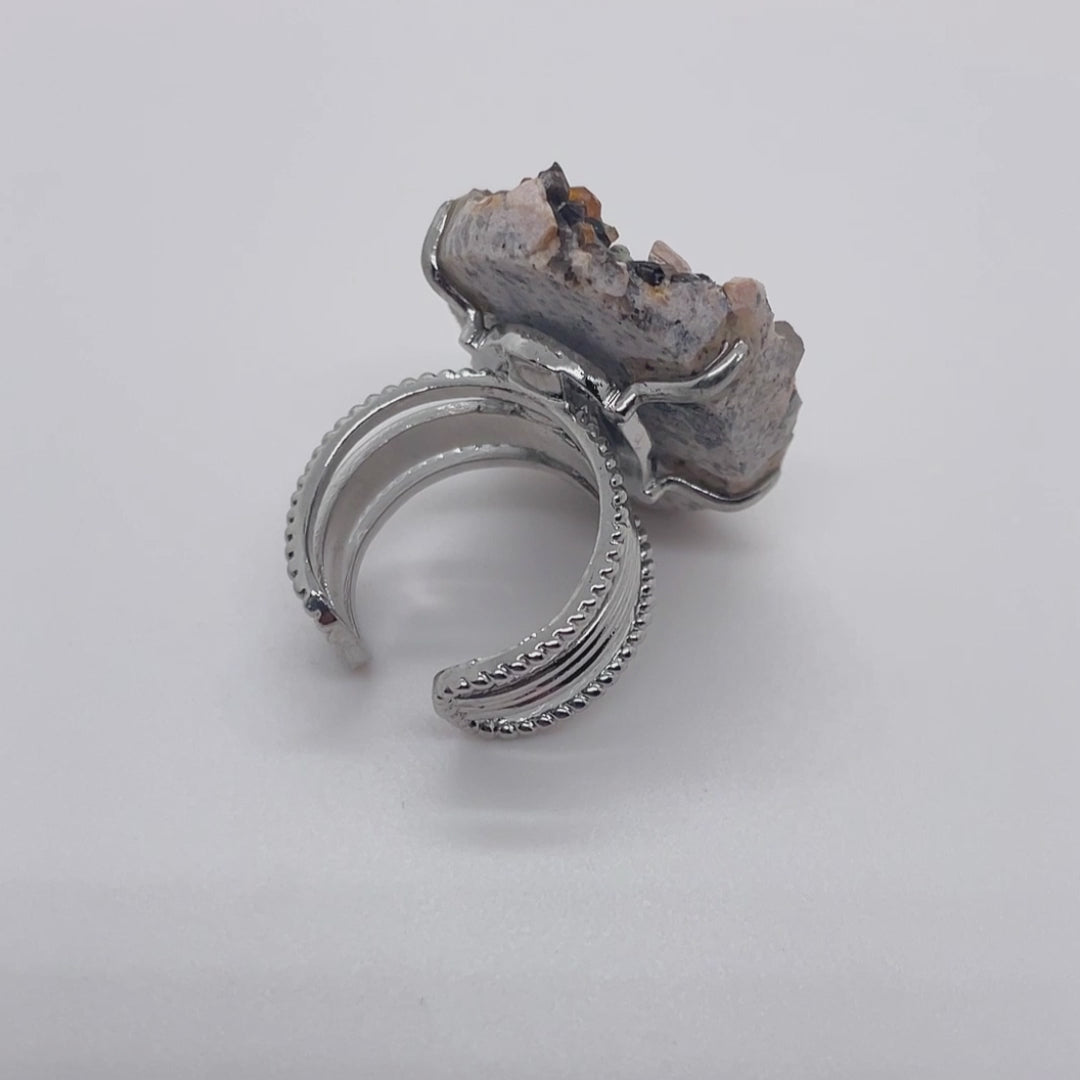 It is inlaid with natural polycrystalline cluster raw stones, and the main body of the ring is made of metal alloy.